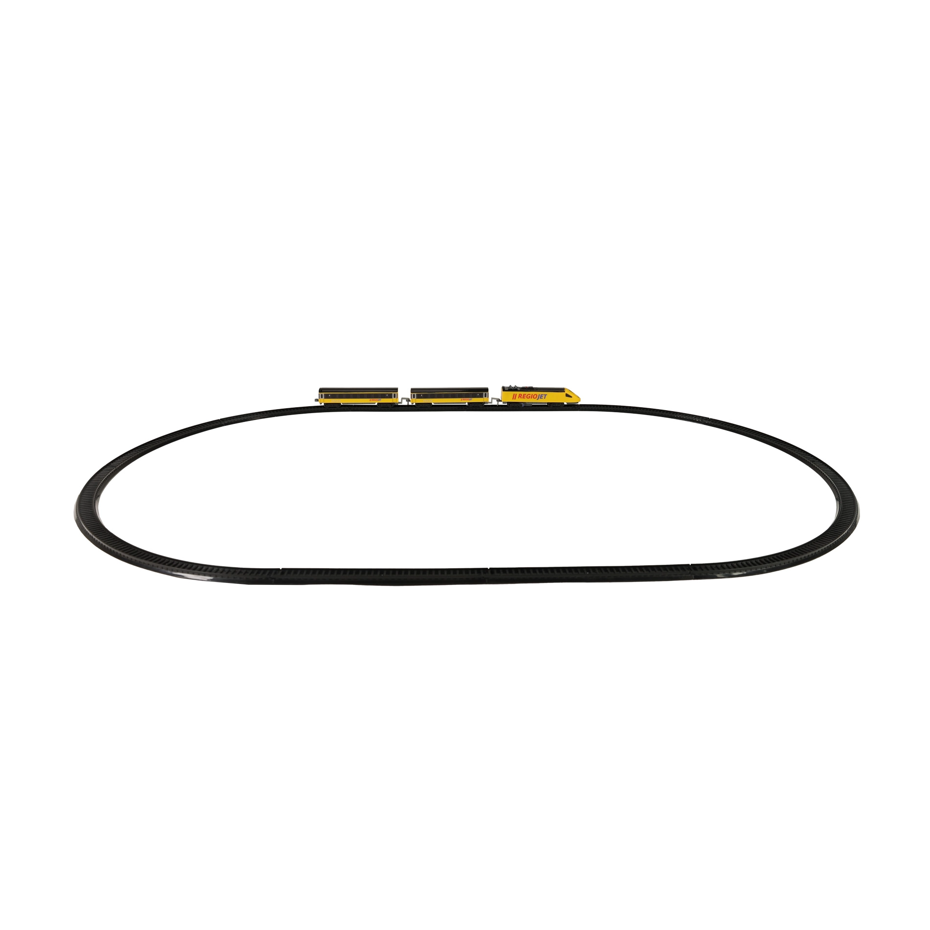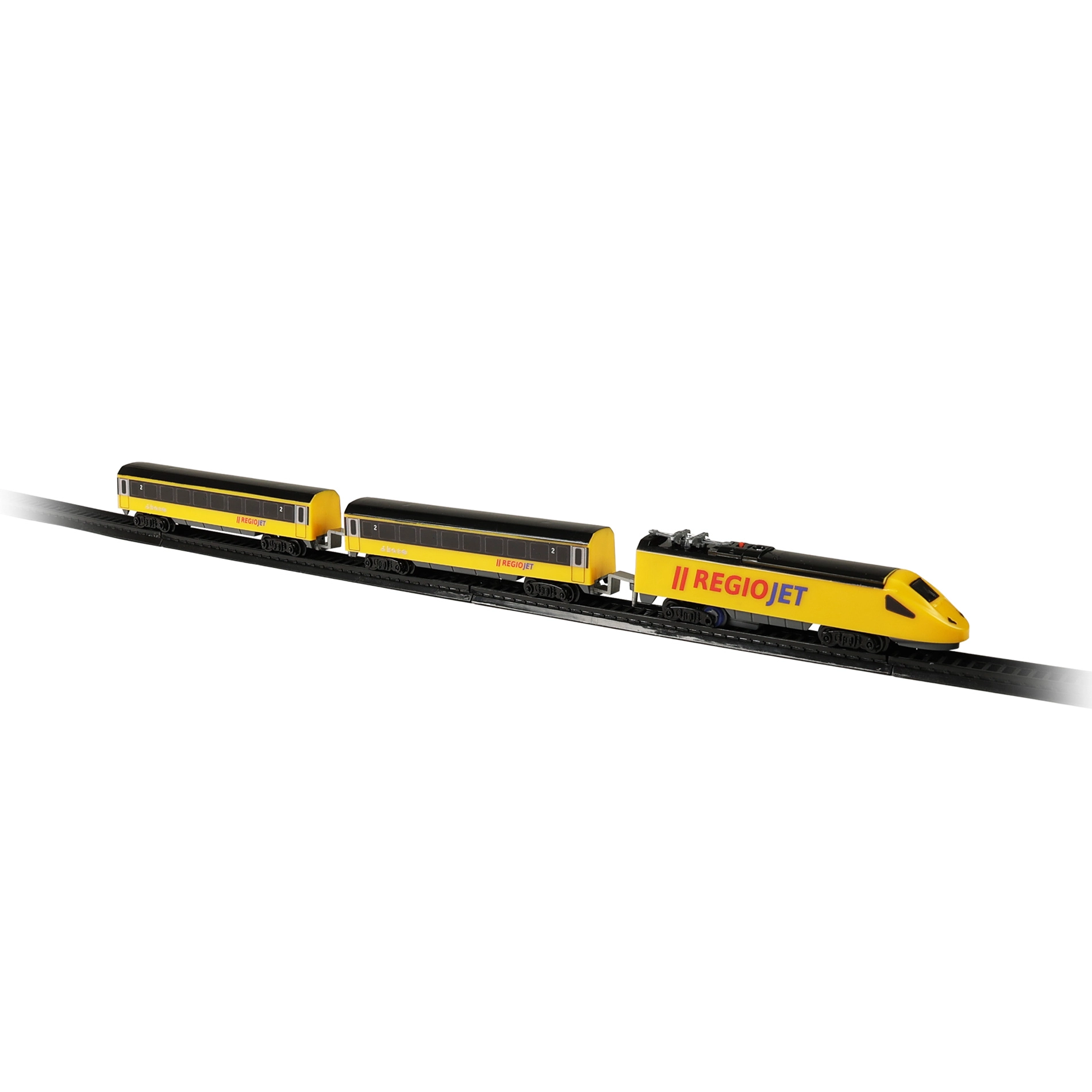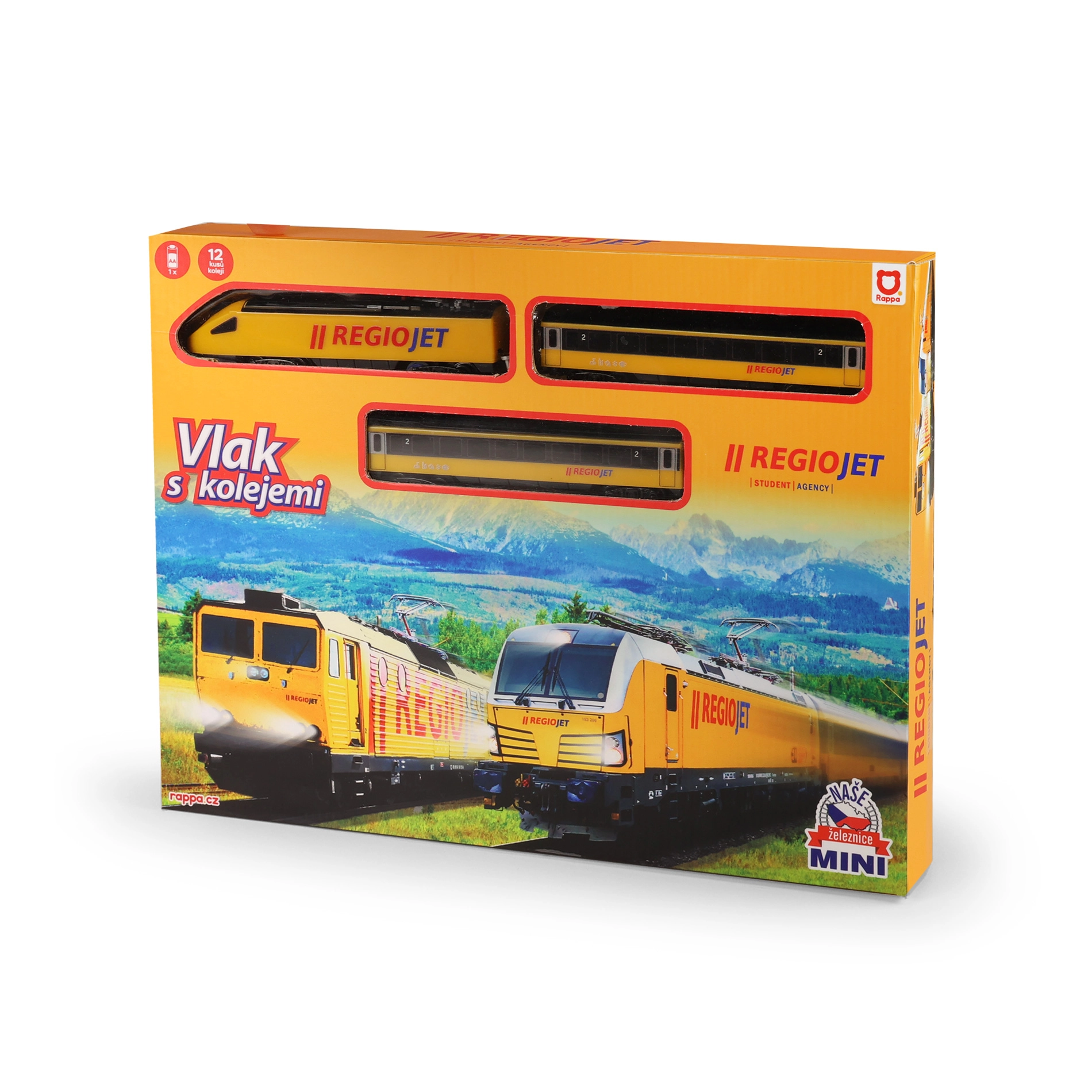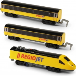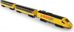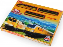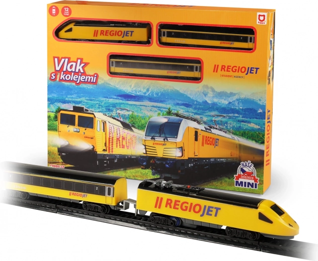 Découvrez le plaisir des petits trains avec le set compact RegioJet MINI. La locomotive jaune et ses deux wagons roulent sur une voie modulaire facile à assembler à partir de 8 pièces courbes et 4 pièces droites. Grâce à l’interrupteur pratique sur le toit de la locomotive, la commande est ultra simple et les enfants peuvent jouer immédiatement.