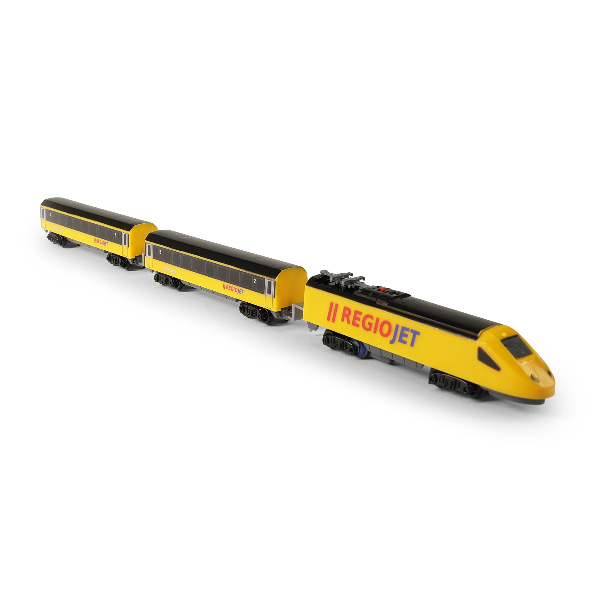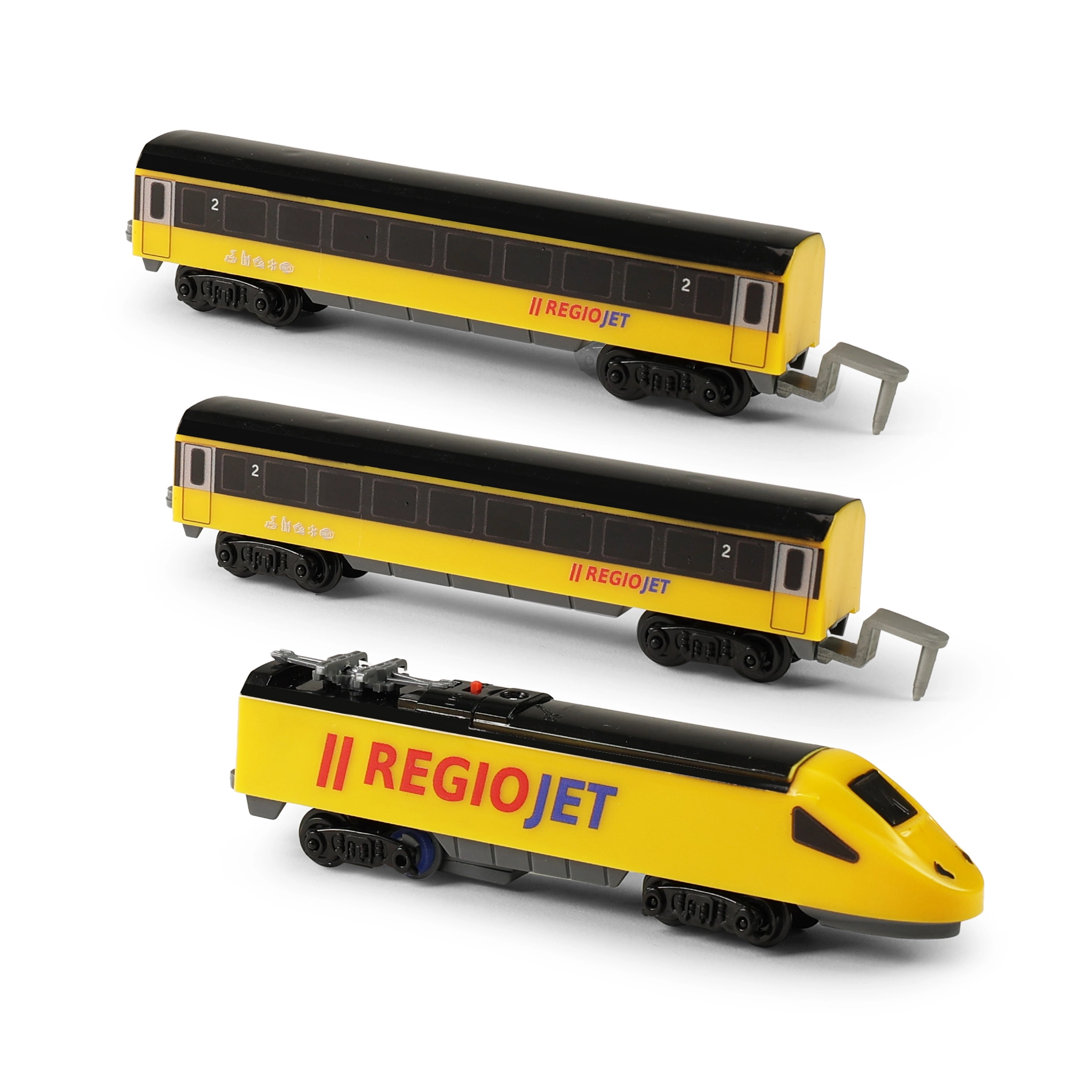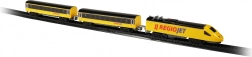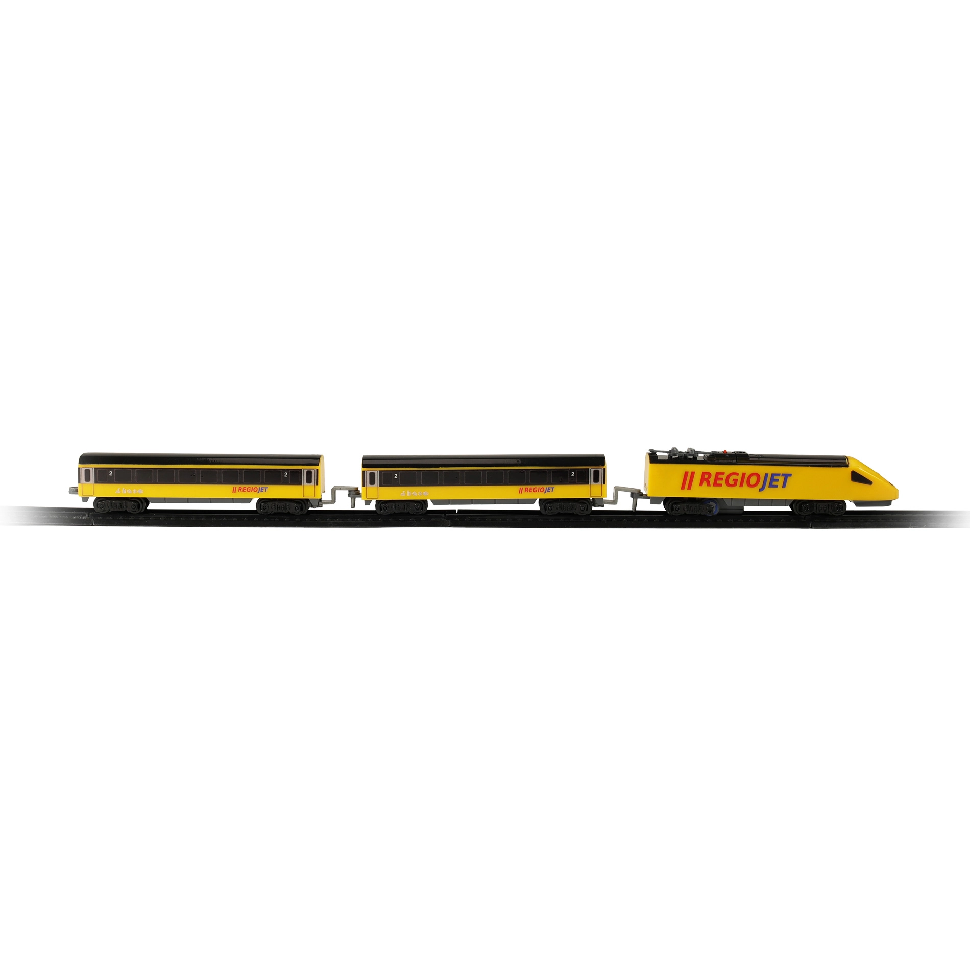 Découvrez le plaisir des petits trains avec le set compact RegioJet MINI. La locomotive jaune et ses deux wagons roulent sur une voie modulaire facile à assembler à partir de 8 pièces courbes et 4 pièces droites. Grâce à l’interrupteur pratique sur le toit de la locomotive, la commande est ultra simple et les enfants peuvent jouer immédiatement.