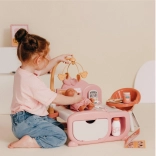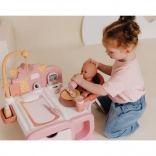 Grâce à des espaces de rangement astucieux et à un set de 19 accessoires thématiques, tout reste à portée de main : biberons, assiettes, thermomètre et autres accessoires pour les rituels quotidiens. Le coin est stable, durable et fabriqué en plastique recyclé, avec un accent sur la sécurité et la durabilité.