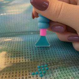 Le plateau rainuré, l’applicateur et la cire assurent une prise et un placement précis des strass aux bons endroits selon les symboles sur la toile.