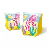 Les brassards ont des illustrations ludiques de méduses, pieuvres et crabes en couleurs vives sur un fond jaune, ce qui encourage les enfants à nager.