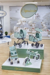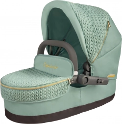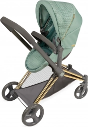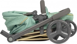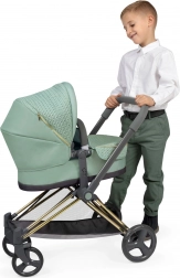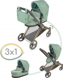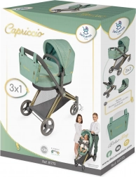 Élégante poussette pour poupées 3 en 1 de la collection CAPRICCIO en vert menthe moderne, proposant une nacelle profonde, un siège sport et une couffin portable. Elle possède une capote réglable, des roues avant pivotantes pour une manœuvrabilité aisée, un panier de rangement et un sac amovible avec fermetures éclair dorées. Grâce à sa structure pliante, elle ne prend pas de place et convient idéalement aux enfants dès 3 ans.