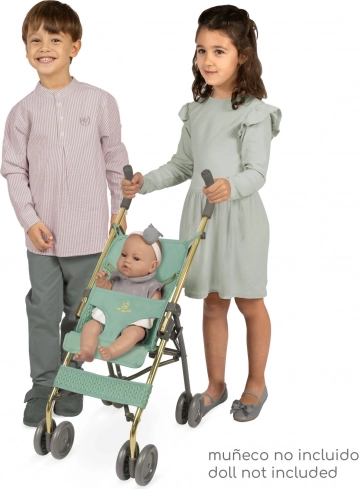 Une poussette pour poupées pliable, stylée et pratique de la collection CAPRICCIO dans une teinte vert menthe moderne, offrant une manipulation facile, une structure métallique stable et un harnais 3 points pour fixer la poupée en toute sécurité. Grâce à ses dimensions compactes, elle est idéale en voyage comme à la maison.