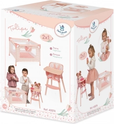 Découvrez l’ensemble de mobilier pour poupées DeCuevas Tulipe 2 en 1, qui allie praticité et design délicat. Les tons saumon pastel avec motif floral et tulipe attirent le regard au premier coup d’œil et complètent à merveille toute chambre d’enfant. Grâce à des matériaux de qualité et à des détails bien pensés, le jeu est confortable, sûr et amusant.