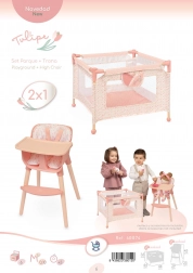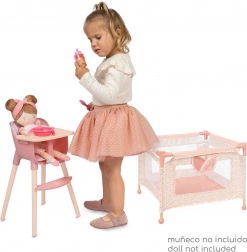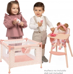 Le set comprend un parc de jeu robuste avec côtés en maille et une poche pratique pour petits objets, ainsi qu’une chaise haute avec tablette amovible et harnais à trois points pour installer la poupée en toute sécurité. Les deux produits sont conçus pour des poupées jusqu’à 36 cm et se distinguent par leur manipulation aisée et leur entretien facile.