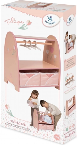 Offrez aux enfants de l’ordre dans l’univers des poupées. Ce portant de dressing en bois compact de la collection TULIPE propose une solution pratique pour suspendre et ranger vêtements et accessoires. La tringle avec 3 cintres en bois accueille des tenues jusqu’à env. 19 cm de longueur, tandis que l’étagère inférieure et les 2 paniers en tissu pliables gardent tout le reste à portée de main.