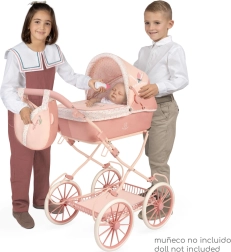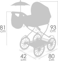 Un sac stylé en forme de tulipe, un parasol pliable et un matelas moelleux pour la poupée sont inclus. Poche de rangement sur la capote, couvre-nacelle avec boutons-pression et panier spacieux sous le châssis ne manquent pas. Les grandes roues à rayons et les ressorts assurent un bercement fluide et une conduite stable.
