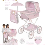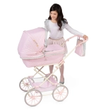 Coloris rose clair, petits nœuds décoratifs et dentelles. Inclus : ombrelle, sac, couvre-nacelle, matelas et douce couverture.