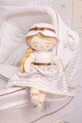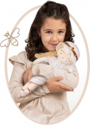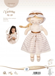 La poupée en peluche Verona 36 cm est une petite amie inspirée par des tons naturels et des motifs discrets, au look intemporel. L’association de beige clair et de blanc à pois ou rayures, complétée par un liseré délicat, souligne l’élégant design espagnol. La poupée est fabriquée dans une peluche de qualité, lisse et légèrement brillante, agréable au toucher et adaptée au jeu quotidien.
