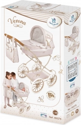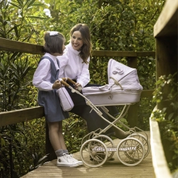 La collection Verona séduit par une délicate combinaison de beige clair et de blanc, agrémentée de fines rayures et pois, complétée d’élégants petits nœuds et de broderies discrètes. La poussette est conçue pour transporter les poupées avec confort et pour une manipulation aisée, tout en se pliant facilement pour gagner de la place.