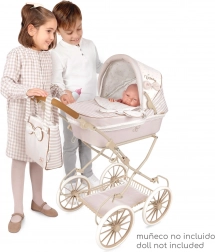 La nacelle rembourrée, la capote pliable et la housse à pressions maintiennent la poupée en sécurité et au chaud. Le style est complété par un sac amovible au design assorti.