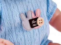 La poupée a des membres et une tête articulés, vous pouvez donc l’asseoir ou la coucher pour dormir. Sa tenue comprend une grenouillère tricotée douce à velcro, facile à enlever et à remettre – avec un bonnet et des chaussons qui favorisent la motricité fine et l’autonomie de l’enfant. Les vêtements sont disponibles en deux variantes de couleurs : rose et bleu clair.