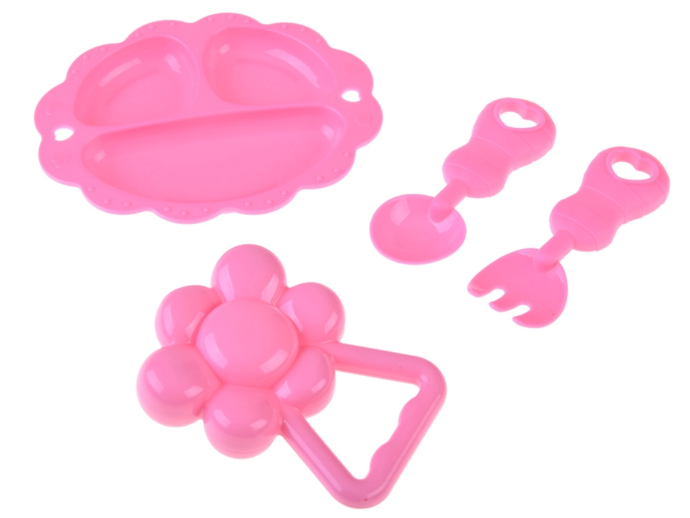Un set de repas pratique de couleur rose est inclus – assiette, cuillère et fourchette – ainsi qu’un hochet. Les enfants peuvent ainsi profiter pleinement des jeux de rôle, développer leur imagination, leur motricité fine et leurs compétences sociales.
