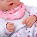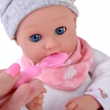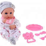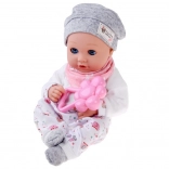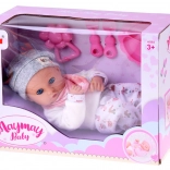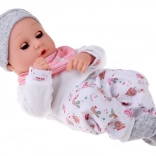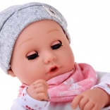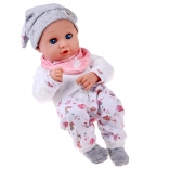 Cette poupée est fabriquée en matière douce et agréable avec une tête et des mains en plastique pour plus de solidité. La tenue aux couleurs délicates comprend un bonnet gris, une blouse douce, un pantalon à motifs et des chaussettes grises. Grâce aux paupières mobiles, la poupée imite fidèlement le sommeil et l’éveil, ce qui favorise le soin naturel et l’empathie.