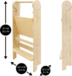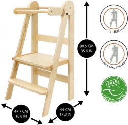 Un design bien pensé permet aux enfants de monter en sécurité et en autonomie grâce à une marche de 16 cm de hauteur. La tour est pliante, se transporte facilement de la cuisine à la salle de bains et prend un minimum de place une fois rangée. Le bois testé ne contient pas de formaldéhyde, vous garantissant un matériau sain.