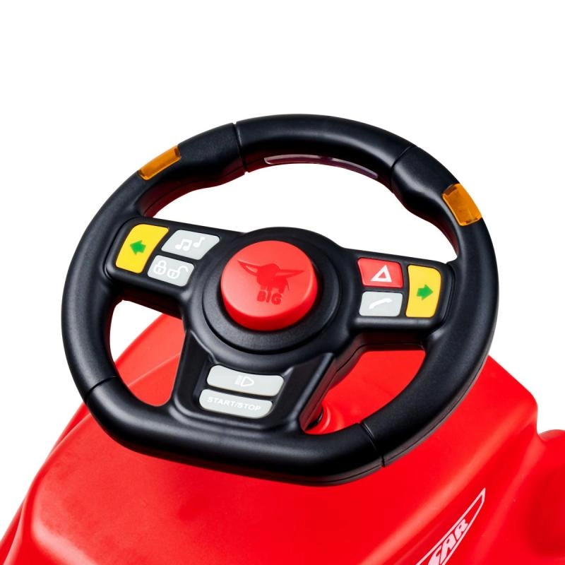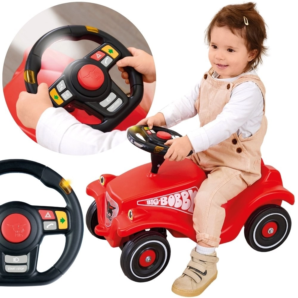 Le volant multifonction BIG transforme chaque trajet en véritable aventure. Les enfants apprécieront les clignotants à LED, le klaxon, le son de démarrage, la radio et d’autres effets réalistes. Grâce à sa conception résistante à l’eau, il convient aussi au jeu en extérieur.