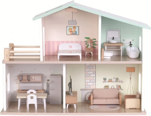 Maison de poupées en bois Anička de 2Kids Toys. 16 pièces, équipement complet, fabrication de qualité, montage facile. Idéale pour les enfants à partir de 3 ans.