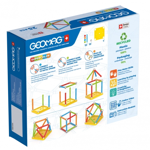 Découvrez le monde créatif avec le jeu de construction magnétique GEOMAG Supercolor composé de 25 pièces – tiges colorées, billes en acier et socle carré pour des constructions stables. Toutes les pièces en plastique sont fabriquées à partir de 100 % de matériau recyclé, produit en Suisse. Inclus : un boîtier de rangement pratique pour un transport facile. Convient aux enfants à partir de 3 ans.