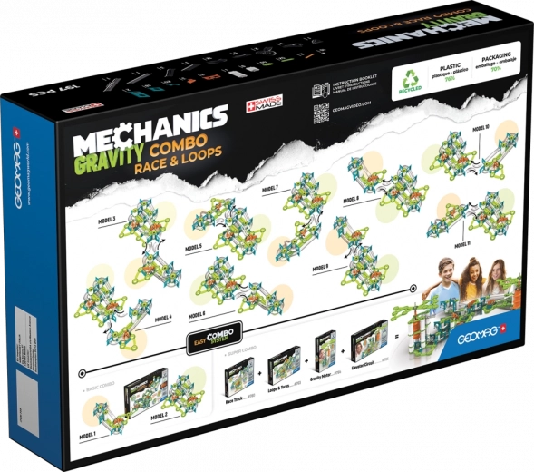 Construisez vos propres pistes gravitationnelles et courses de billes grâce au kit de construction GEOMAG Mechanics Gravity Combo. Avec 197 pièces, créez facilement jusqu’à 11 circuits différents avec loopings, virages et déclencheurs. Un jouet en plastique recyclé, fabriqué en Suisse, qui développe de manière ludique la logique, la créativité et la compréhension de la physique. Convient à partir de 8 ans.