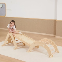 La planche est compatible avec les accessoires (bascule/rocker et triangle d’escalade), ce qui permet de créer un ensemble modulaire pour l’exercice à domicile et le jeu actif. Adapté dès 18 mois, il développe l’autonomie, l’assurance motrice et le plaisir de l’activité naturelle inspirée des principes Montessori.