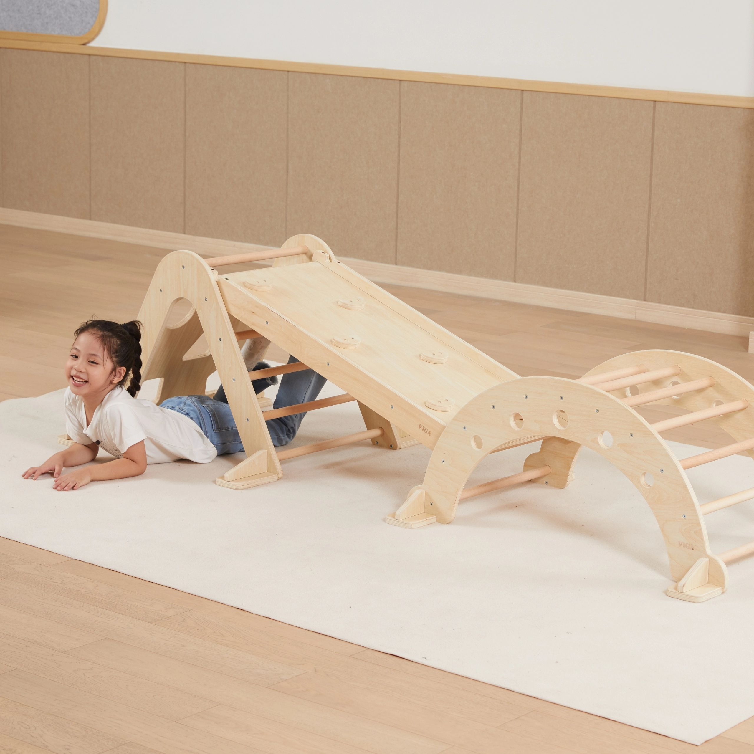 La rampe et le mur d’escalade en bois polyvalents de la marque VIGA transforment la chambre d’enfant en un mini terrain de jeu intérieur sûr. Un côté sert de toboggan lisse ou passerelle, l’autre de mur d’escalade avec prises. Compatible avec le basculeur/rocker et le triangle, il favorise la motricité globale, l’équilibre et la coordination.