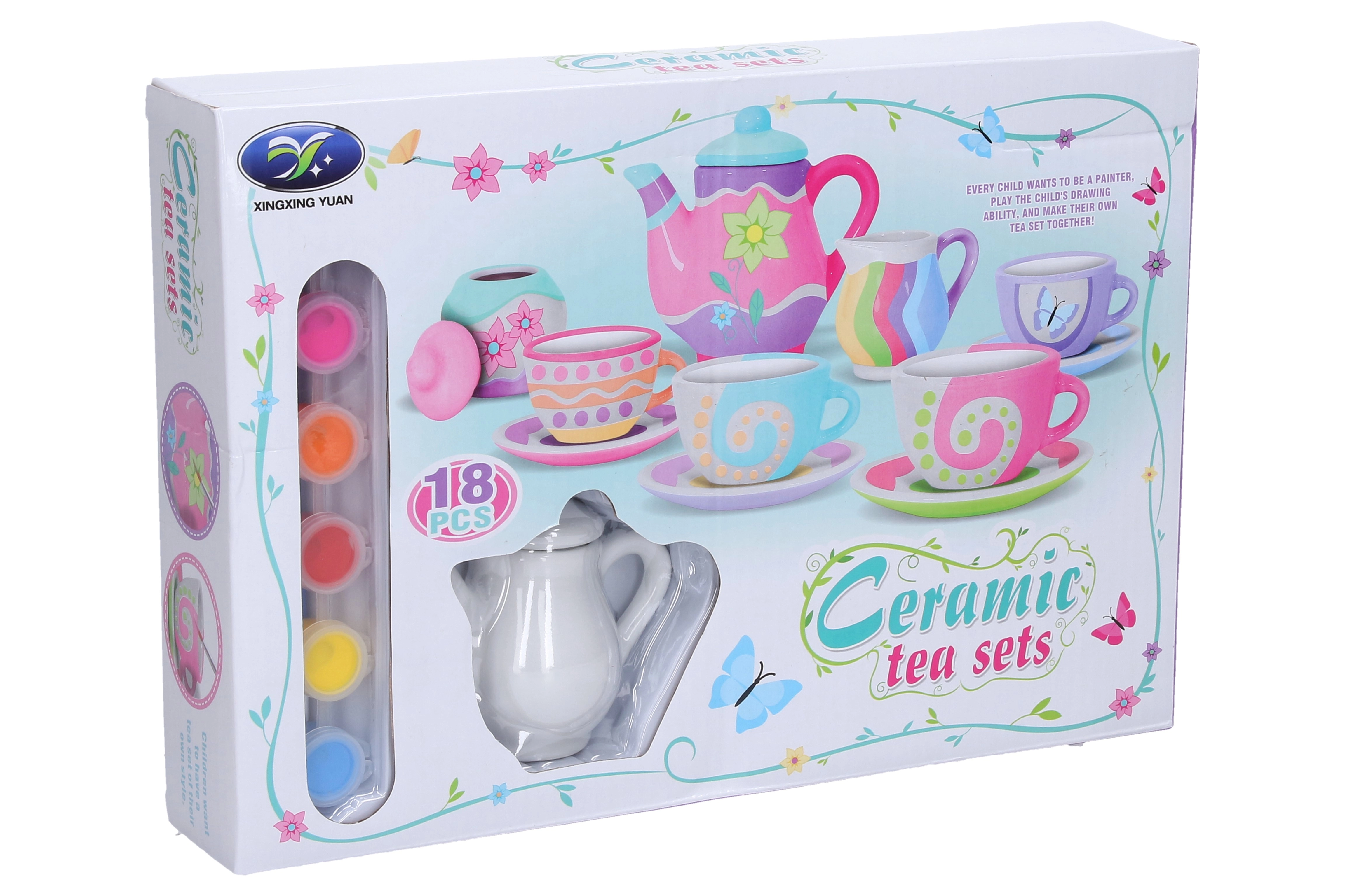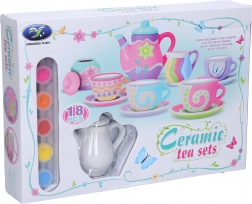 - 6 couleurs, pinceau, 4 tasses avec soucoupes, théière, sucrier