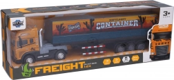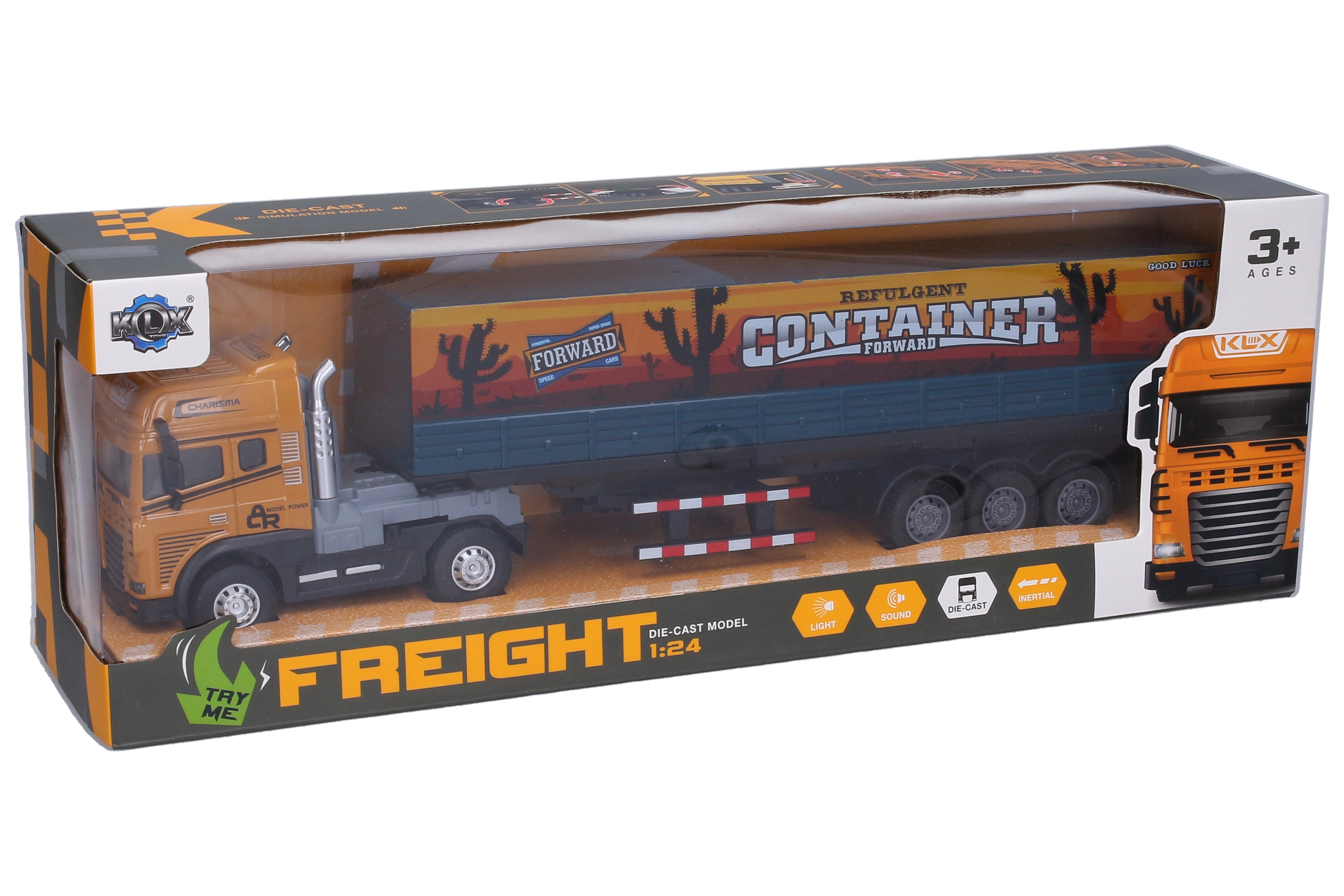 Un tracteur métallique réaliste avec semi-remorque conteneur détachable ravira petits et grands conducteurs. Il offre des effets lumineux et sonores, un mécanisme à inertie pour une conduite fluide, des portes de conteneur ouvrantes et l’activation des effets par le mouvement des roues avant. La longueur du modèle est de 40 cm, les piles 3× AG13 sont incluses dans l’emballage.