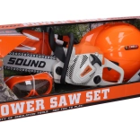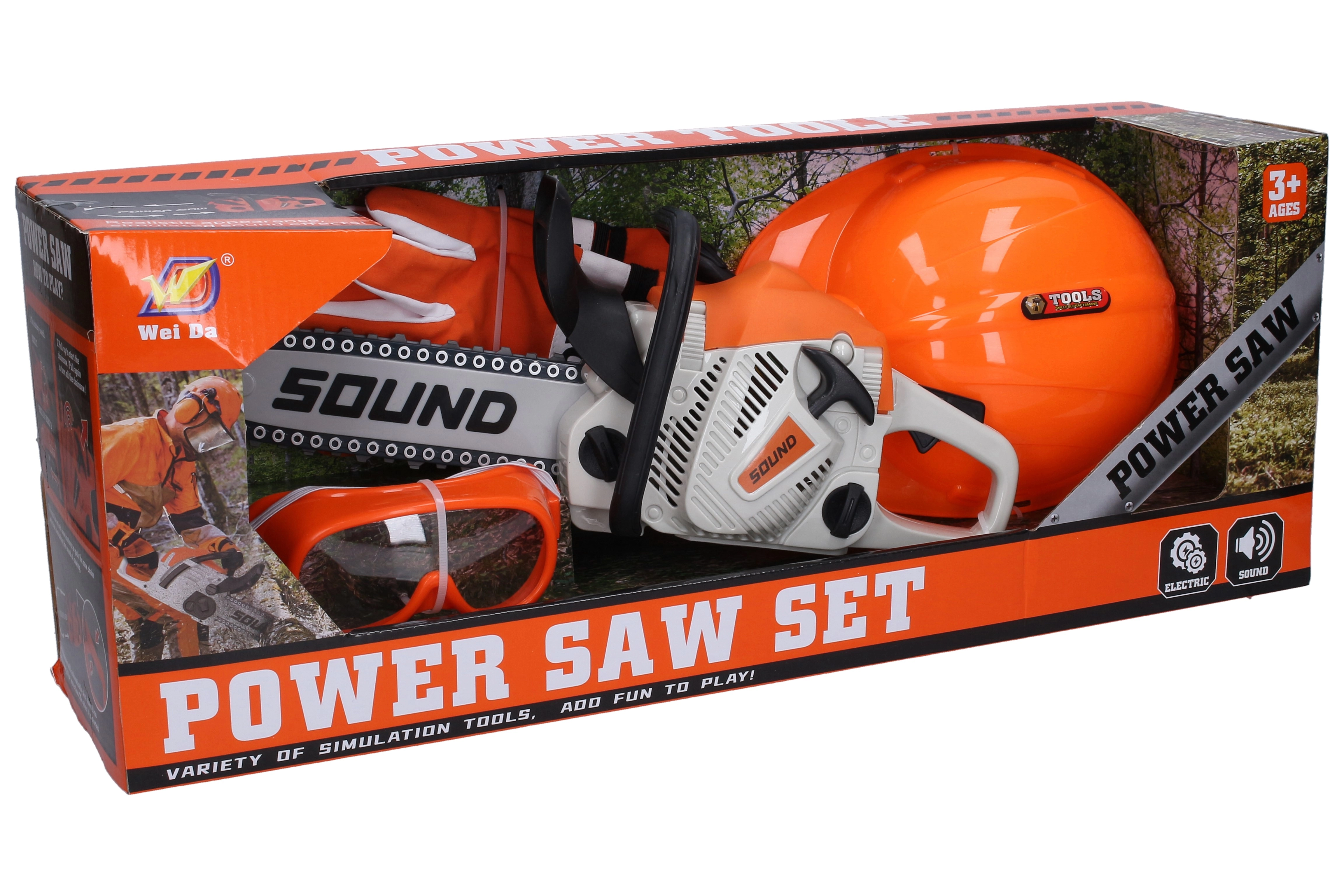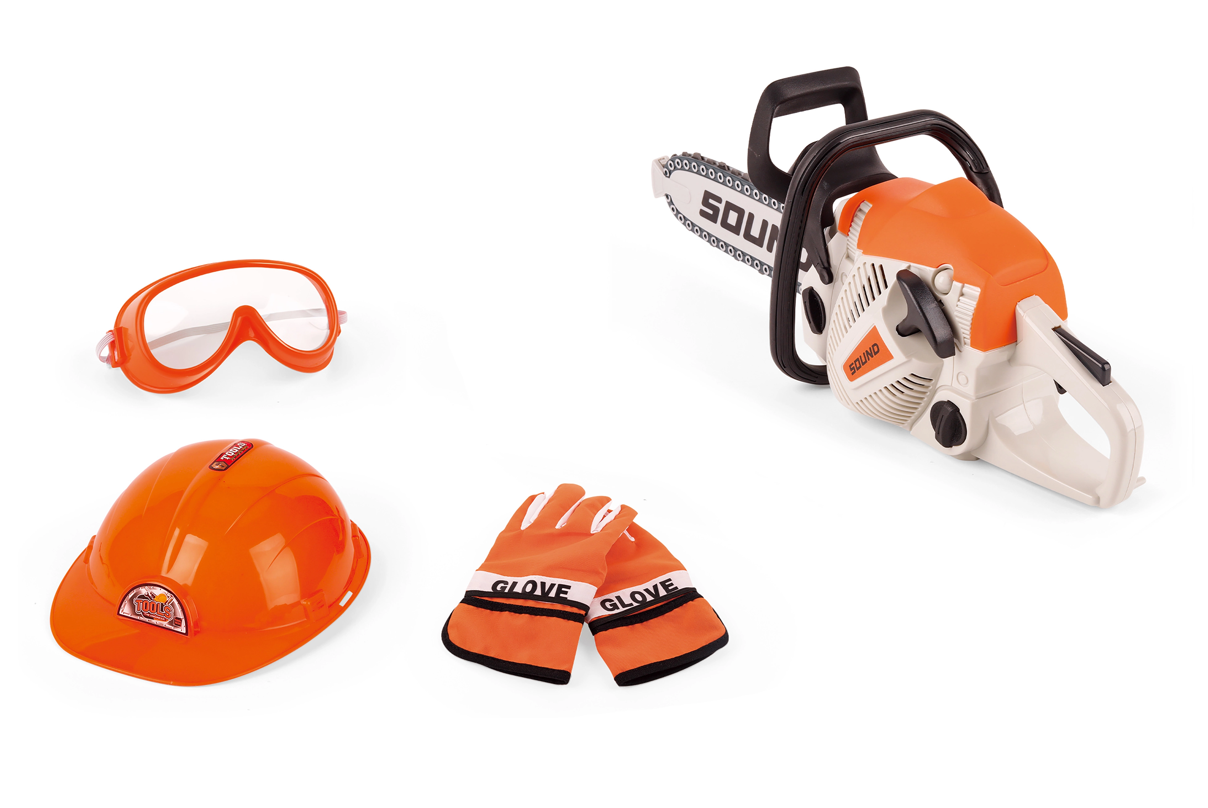 Le coffret inclut l’équipement de base — casque, gants et lunettes de protection — pour encourager les bons réflexes de sécurité pendant le jeu. Avec sa longueur compacte de 35 cm, la tronçonneuse tient bien en main et est facile à manipuler par les enfants.