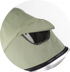 Le dossier réglable sur 3 positions, le canopy ajustable avec pare-soleil amovible et fenêtre, ainsi que la chancelière rembourrée offrent un maximum de confort par tous les temps. L’équipement de sécurité comprend un harnais 5 points avec rembourrages doux, une barre d’appui amovible recouverte de simili cuir, un frein arrière couplé et une dragonne de sécurité au guidon. Le grand panier et le sac à langer facilitent les sorties quotidiennes.