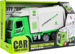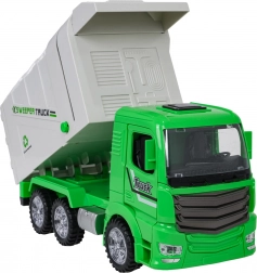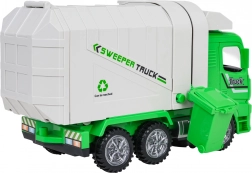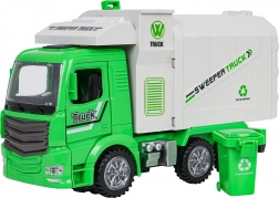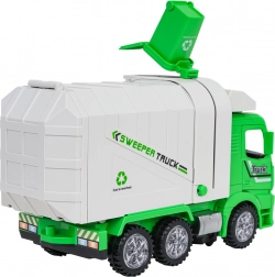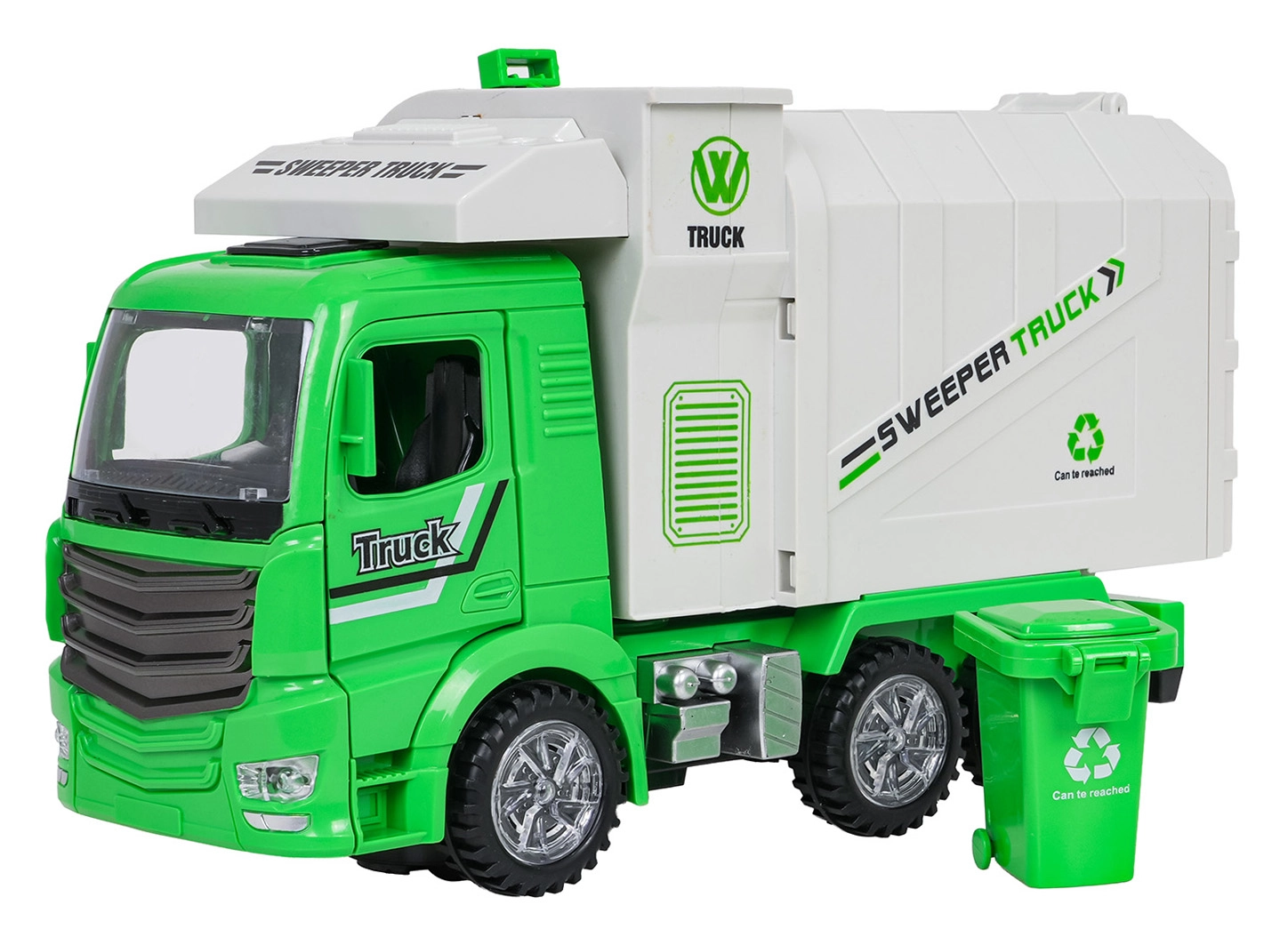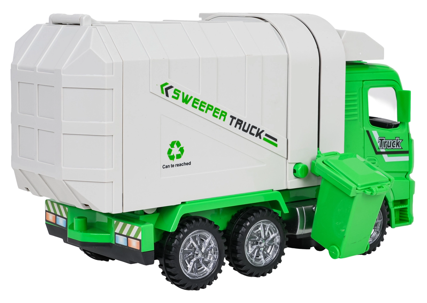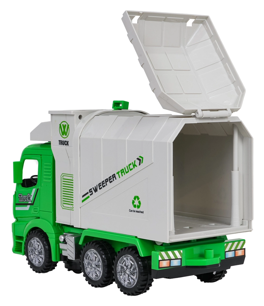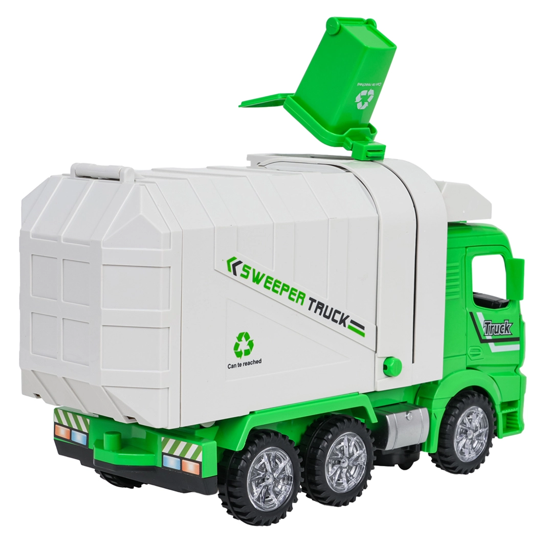 Les effets sonores comme la conduite, le freinage, le klaxon et une mélodie joyeuse rendent le jeu très réaliste. La poubelle fournie se fixe facilement sur le côté du camion pour vider son contenu dans la trémie. Le jouet fonctionne avec 3× piles AA 1,5 V (non incluses).