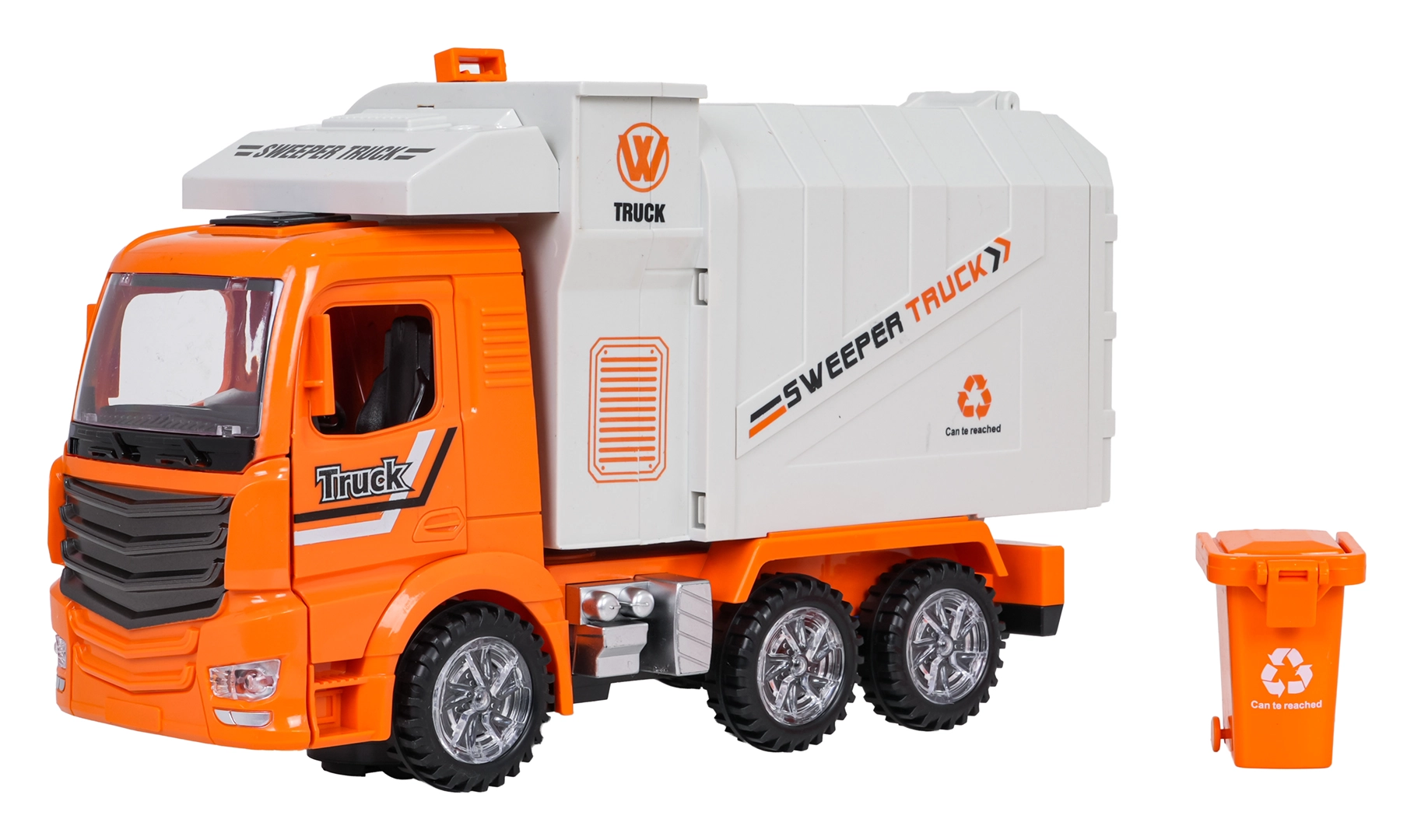 Une poubelle est incluse, pouvant être accrochée sur le côté du véhicule et basculée dans la trémie. La trappe arrière et les portes de la cabine ouvrantes ajoutent encore plus de possibilités de jeu.