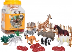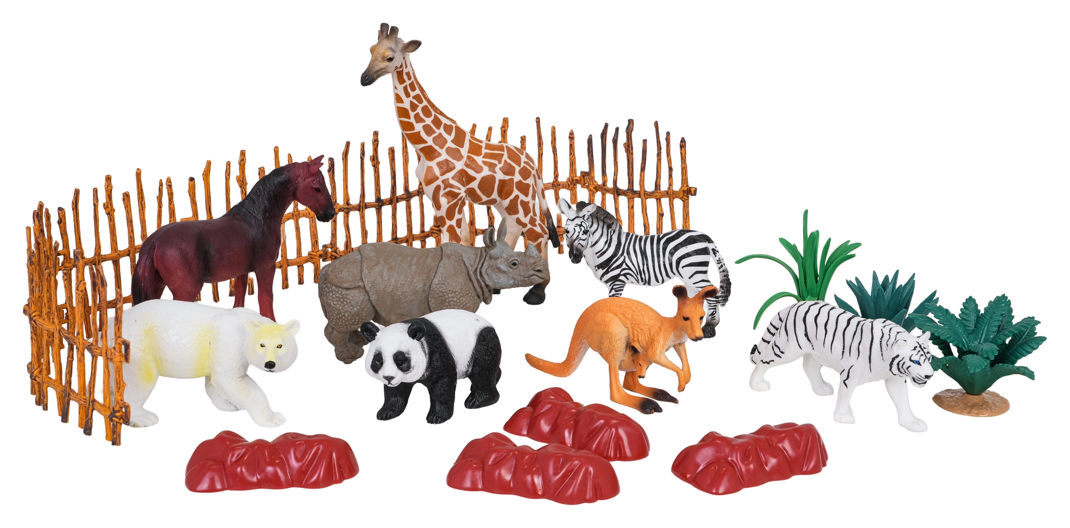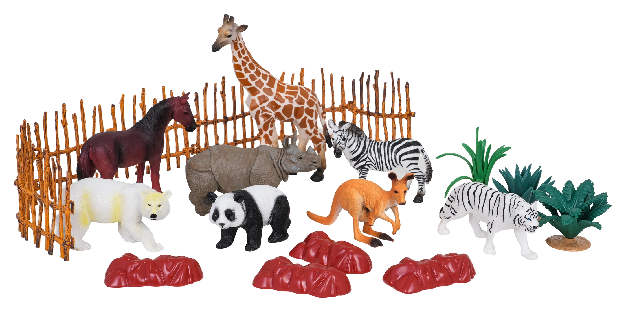 - Boîte en plastique avec poignée (emballage) ; figurines : kangourou, panda, ours polaire, tigre, rhinocéros, zèbre, cheval, girafe ; 3× plante ; 4× rocher ; 7× élément de clôture ; guide avec description des animaux (EN)