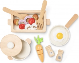- Poêle, casserole avec couvercle, 2× spatule, salière, poivrière, carotte à scratch (3 pièces), autres ingrédients en bois