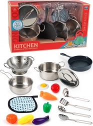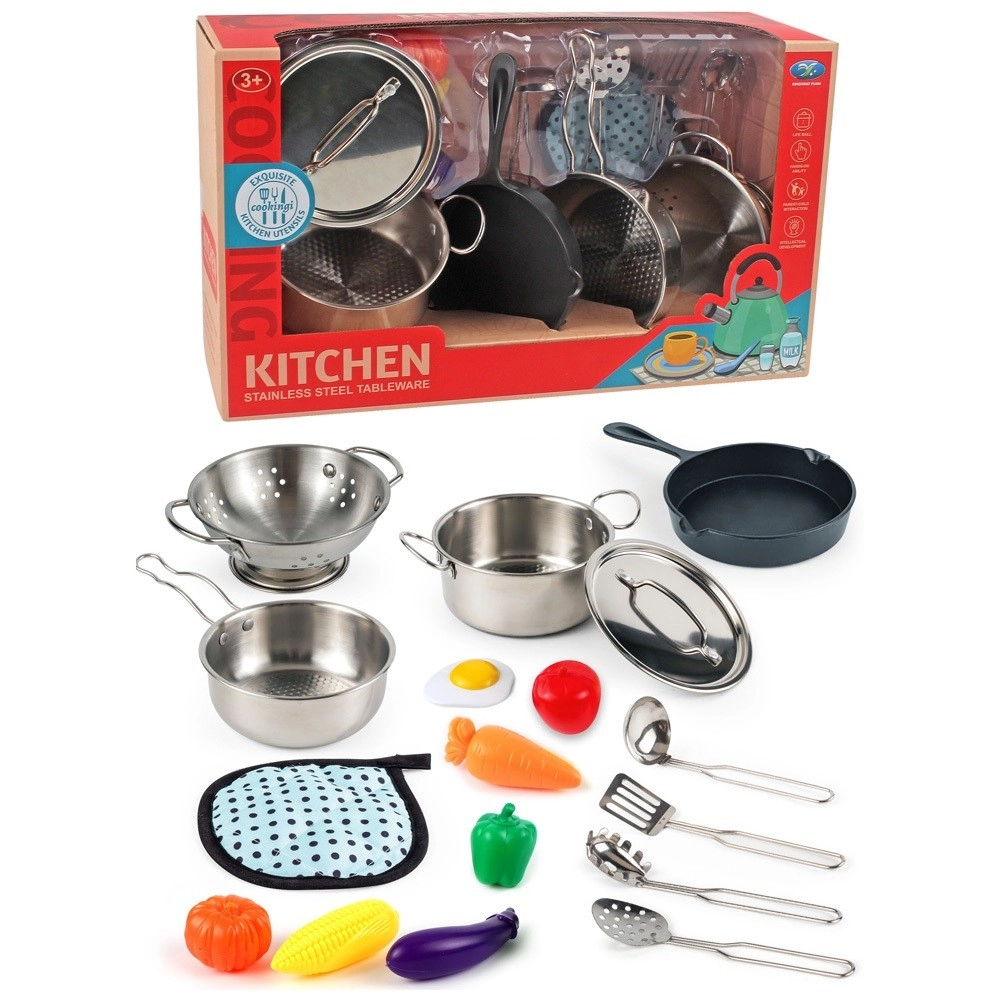 Découvrez l’amusant set de cuisine en métal pour petits chefs comprenant 17 éléments. Il inclut un faitout, une poêle, des couvercles, une passoire, des ustensiles de cuisine, des légumes en plastique et un tapis en tissu. Un excellent jouet pour le développement de la créativité, de la motricité fine et le jeu de rôle de petit chef.