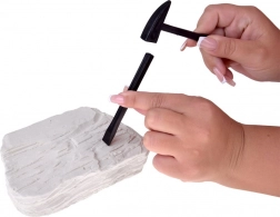 Chaque bloc cache une surprise – il peut s’agir d’un crâne de mammouth, de tigre à dents de sabre, d’aigle, de crocodile et d’autres créatures fascinantes. Avec le marteau, les ciseaux à pierre et la brosse, les enfants découvrent le métier de jeune archéologue et révèlent pas à pas la trouvaille cachée.