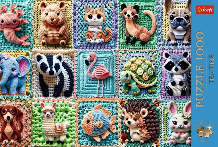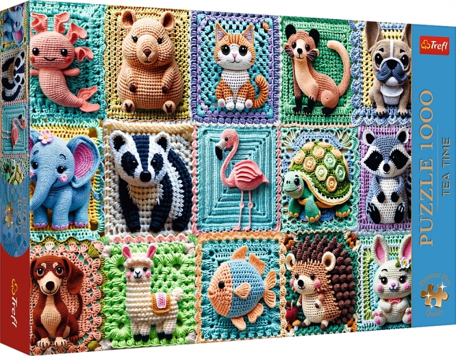 Puzzle TREFL Premium Plus 1000 pièces avec motif d’animaux au crochet. Carton de qualité, pièces uniques, certification FSC et modèle inclus. Dimensions 68,3 × 48 cm.