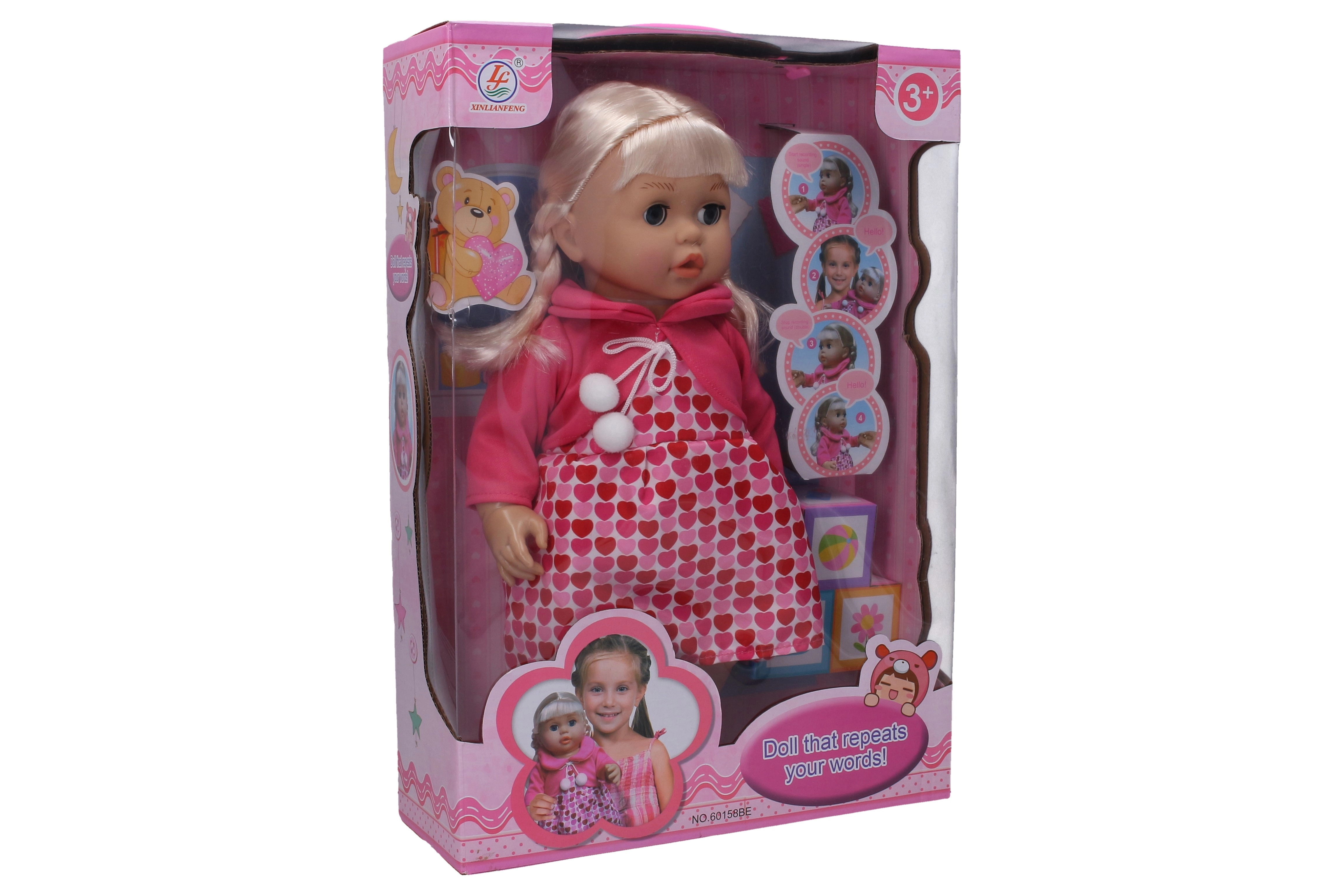 Une poupée amusante qui répète ce que vous dites ! En appuyant sur la main droite, l’enregistrement démarre, et en appuyant sur la main gauche, la poupée rejoue votre message. Taille 40 cm. Jouet interactif pour développer le langage et s’amuser. Utilisation facile grâce aux boutons dans les mains. Piles 2× AA non incluses.