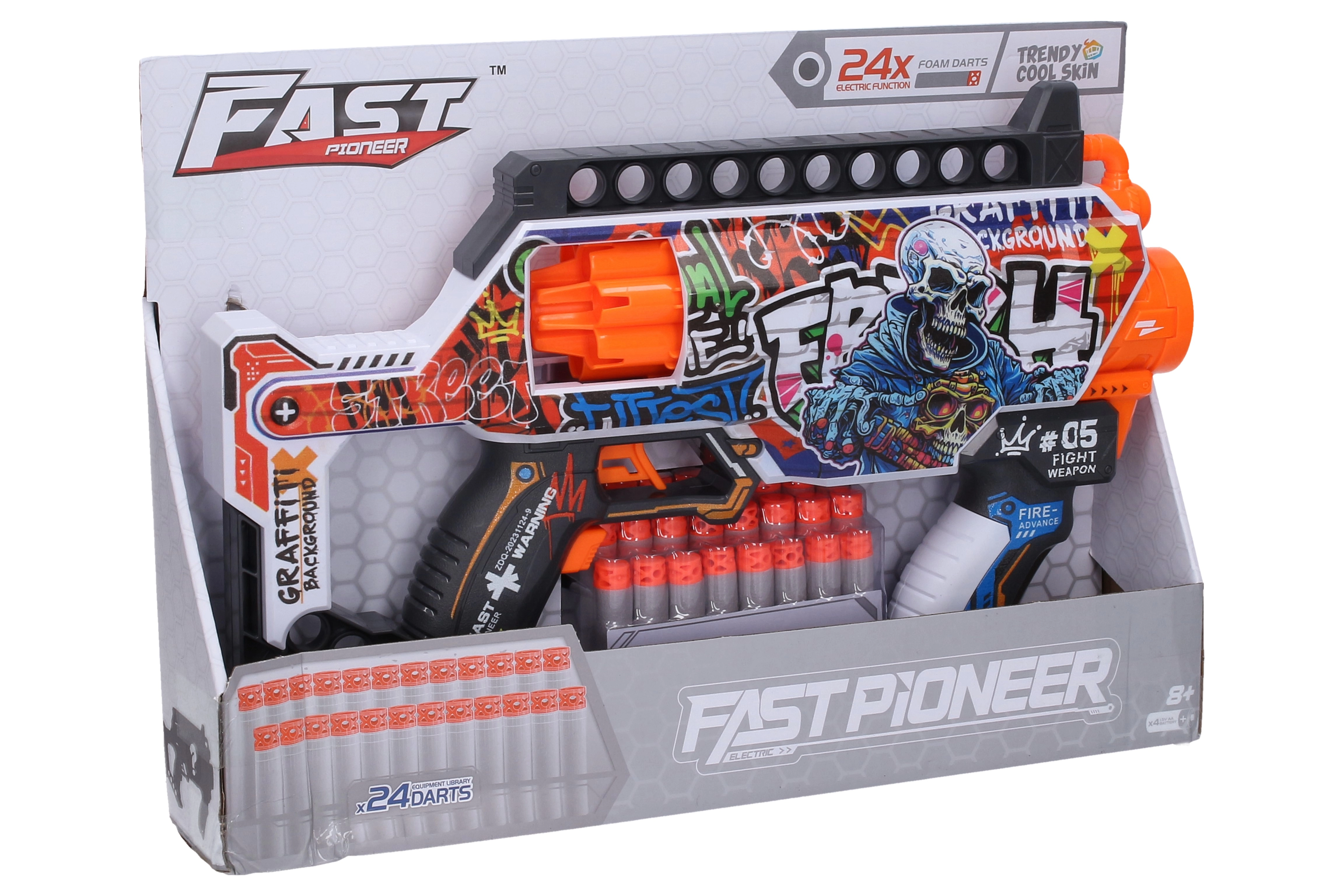 Jouet amusant pour jeux d’action – pistolet-mitrailleur à fléchettes en mousse, style revolver, longueur 35 cm. Il offre un tir rapide, des projectiles souples et sûrs, et une utilisation simple avec des piles 4× AA (non incluses). La boîte comprend 24 fléchettes en mousse pour de longues parties à la maison comme en extérieur.