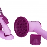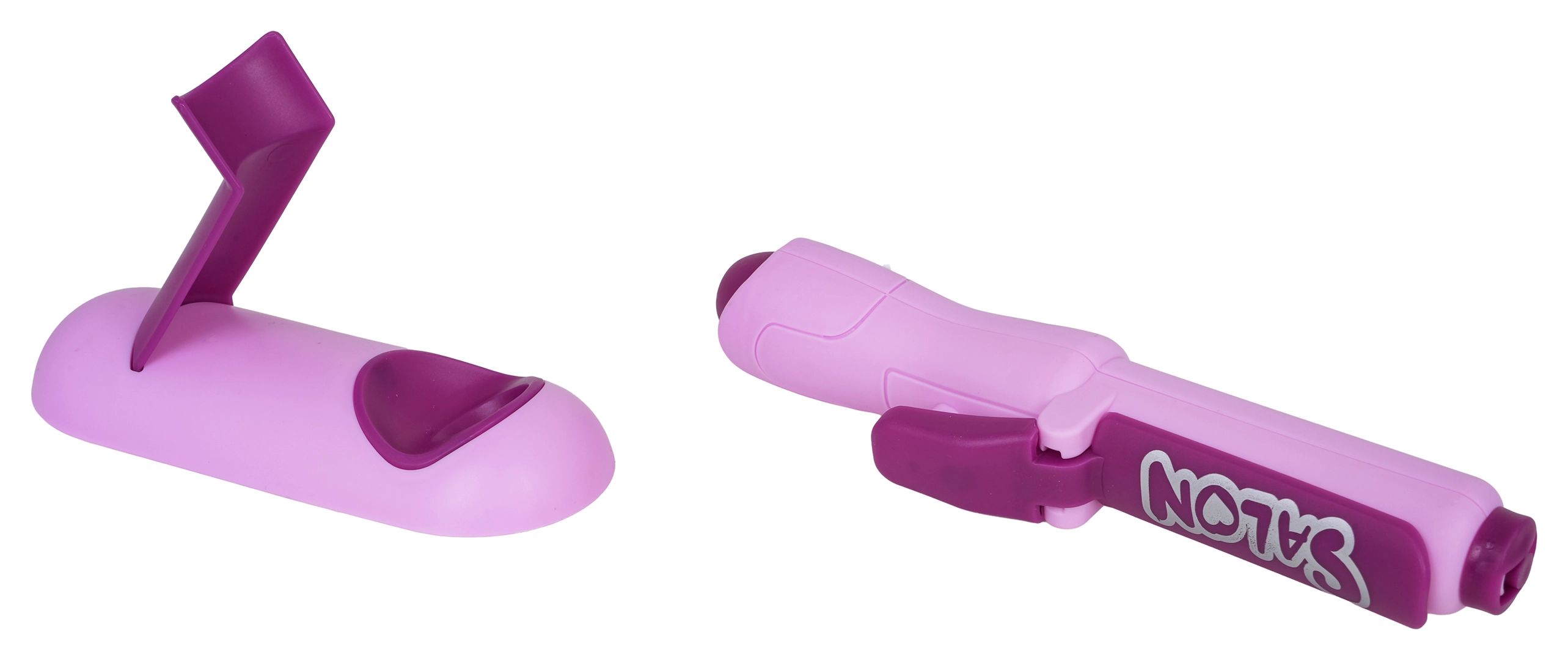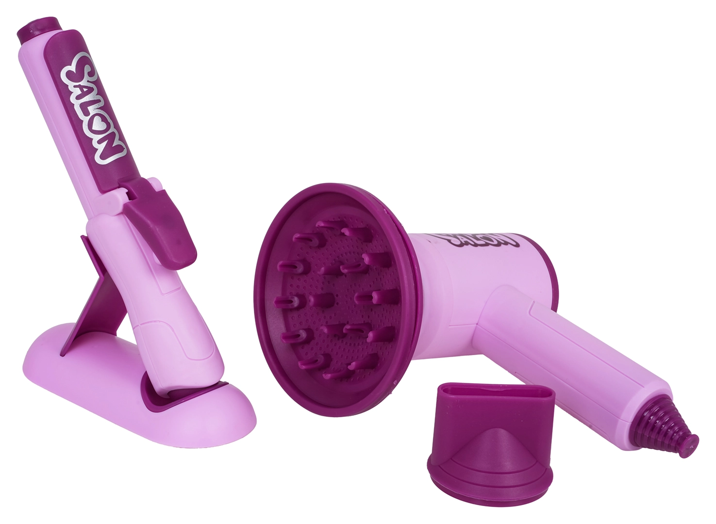 Le set comprend un sèche-cheveux pour enfants avec deux embouts (diffuseur et concentrateur) qui émet un son de séchage et fournit un léger flux d’air pour une expérience authentique. Le fer à lisser pour enfants est alimenté par des piles bouton et possède un effet lumineux. Le set est complété par un peigne, une brosse, des ciseaux, des ciseaux sculpteurs, des pinces, des bigoudis et un petit flacon « cosmétique » – parfait pour un jeu créatif et le développement de la motricité fine.