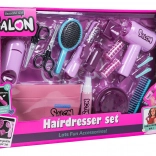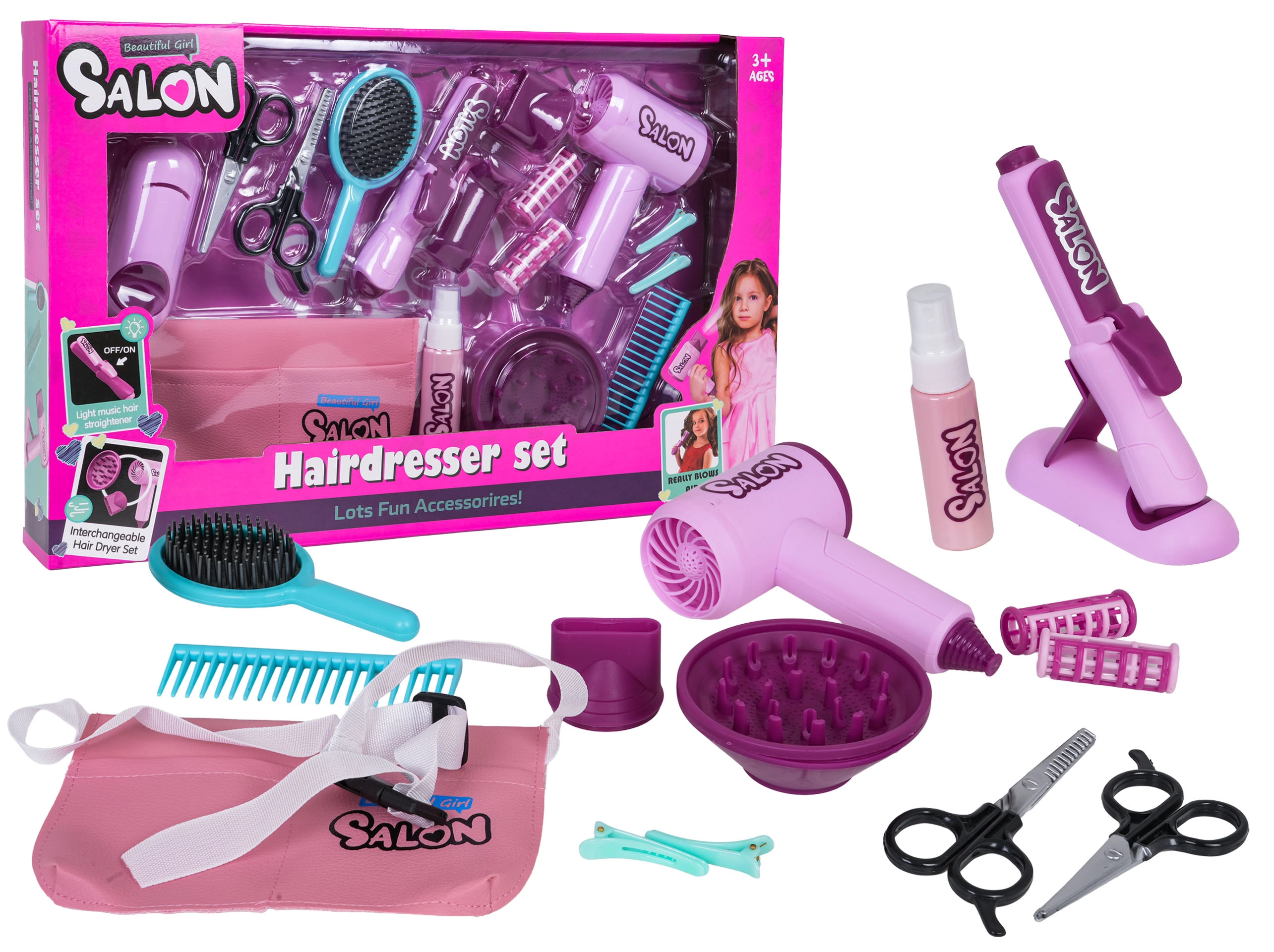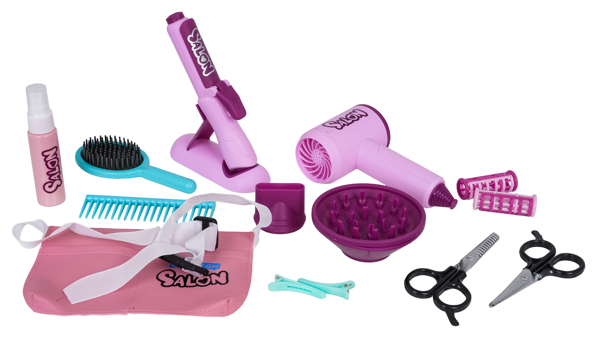 Découvrez la magie de votre propre salon avec cet ensemble richement équipé pour petites coiffeuses dès 3 ans. Il comprend un sèche-cheveux pour enfants fonctionnel avec embouts interchangeables, un fer à lisser lumineux, un fer à boucler, un peigne, une brosse, des pinces, des bigoudis, des ciseaux et une pratique pochette rose à porter à la taille. Le sèche-cheveux émet un son et un léger « souffle », le lisseur s’illumine – idéal pour un jeu de coiffure réaliste.