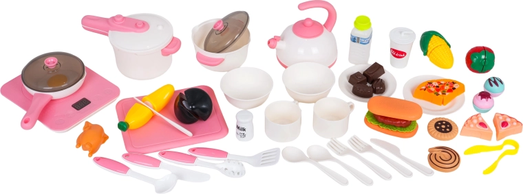 Le set est richement équipé – de la vaisselle et des couverts à la poêle, la cocotte-minute et la petite théière, jusqu’aux aliments à scratch attrayants (fruits, légumes, pizza, desserts). On trouve aussi un présentoir à gâteaux, des placards de rangement, des crochets pour ustensiles et un égouttoir à vaisselle. La cuisine favorise ainsi le jeu de rôle, la motricité fine et les compétences sociales.