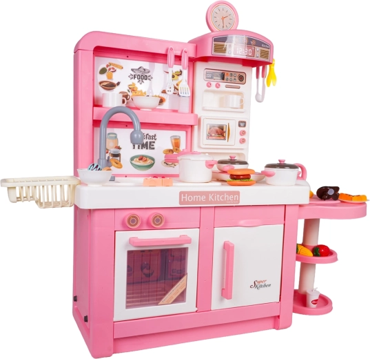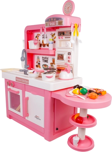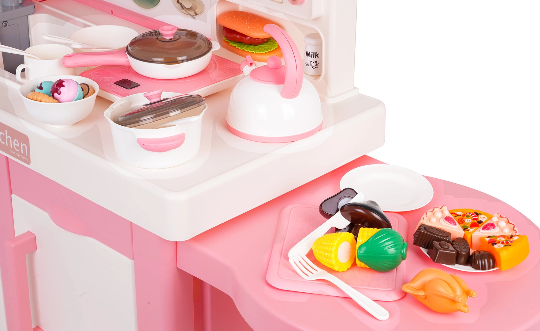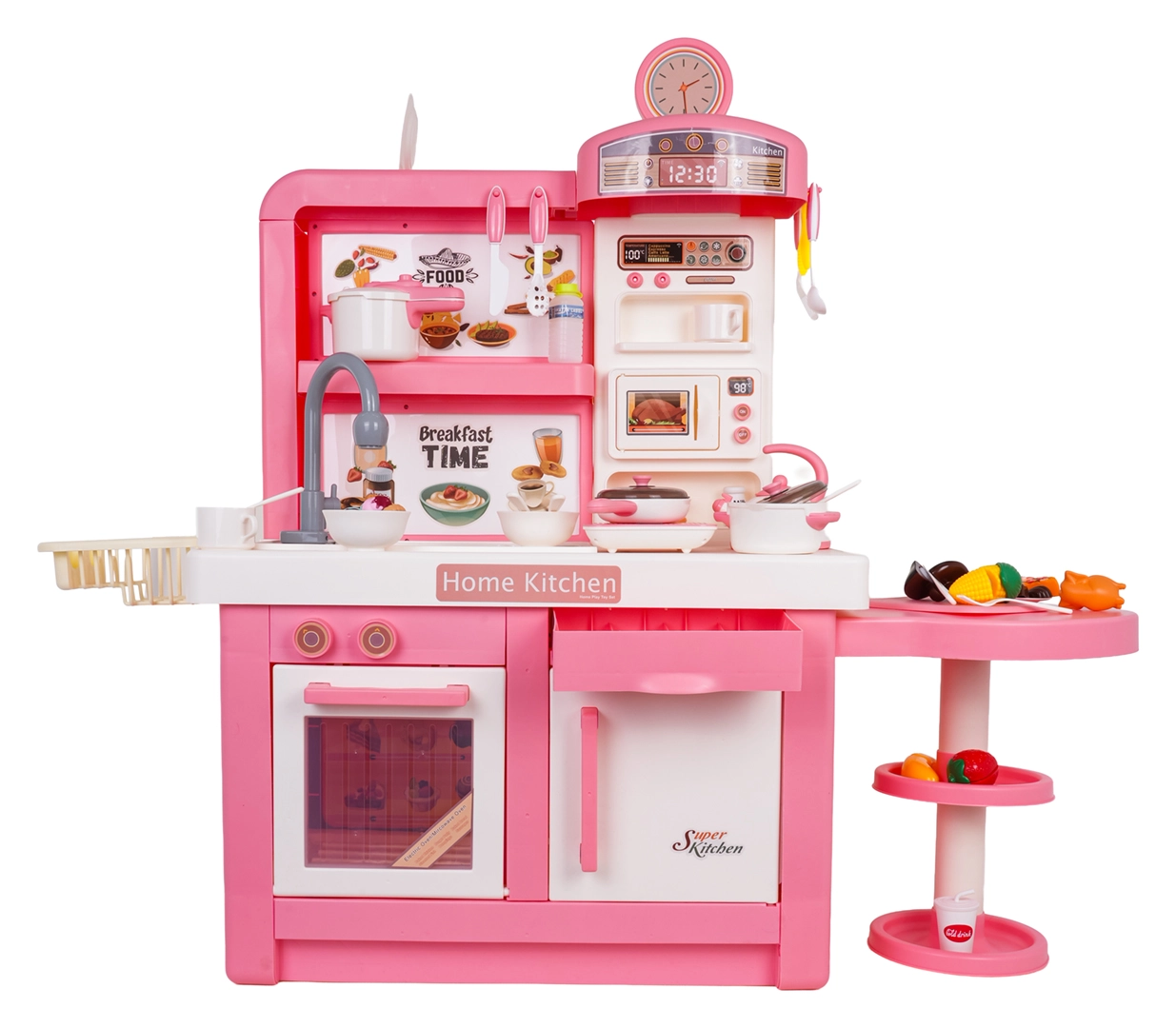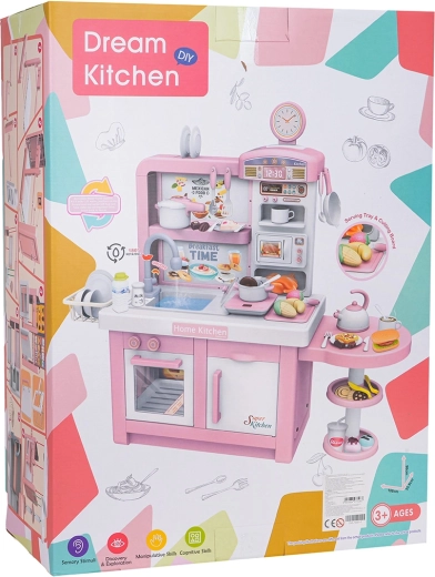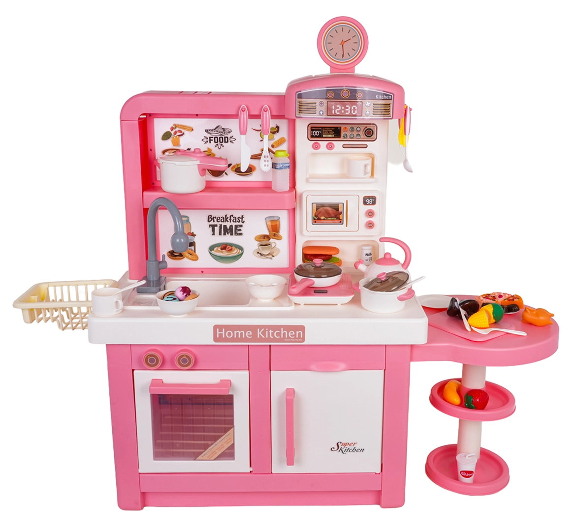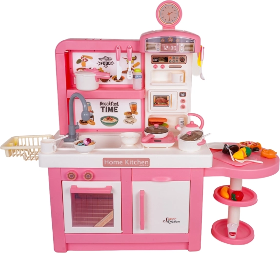 Cette cuisine interactive en rose et blanc est conçue pour un jeu créatif en toute sécurité. Les enfants profiteront d’éléments réalistes comme le micro-ondes, l’évier avec robinet, la plaque à induction, le four, la cafetière et le “réfrigérateur”. Les boutons rotatifs émettent des sons de cuisson et de friture, le brûleur éclairé avec affichage de la température intensifie l’ambiance, et une douce vapeur froide s’échappe d’une casserole.