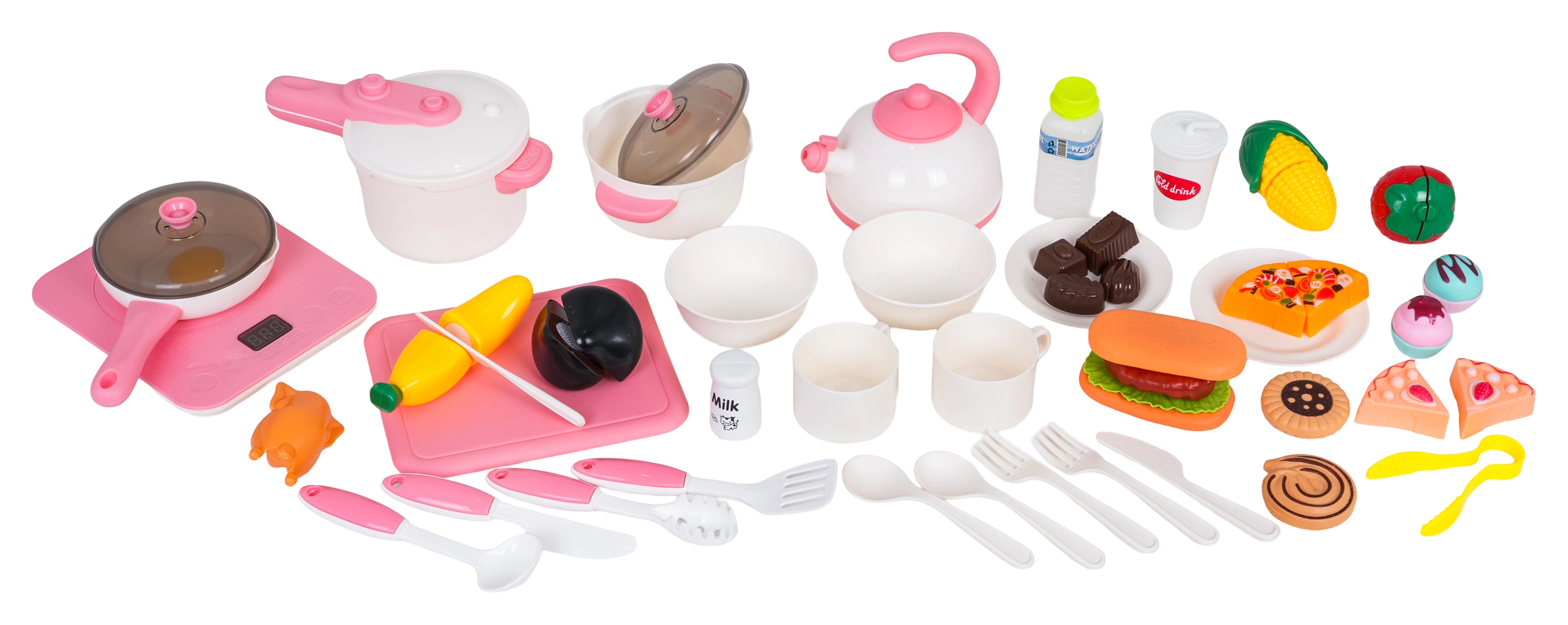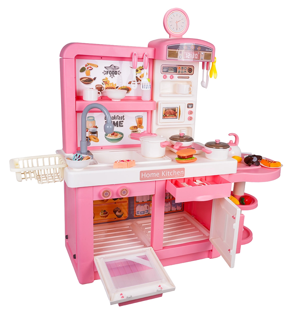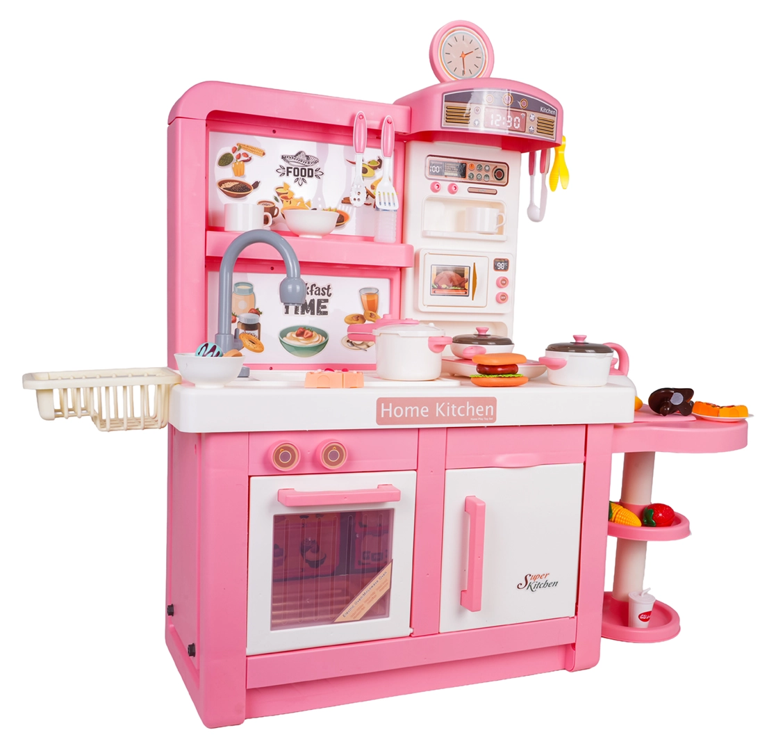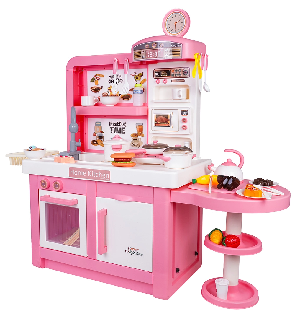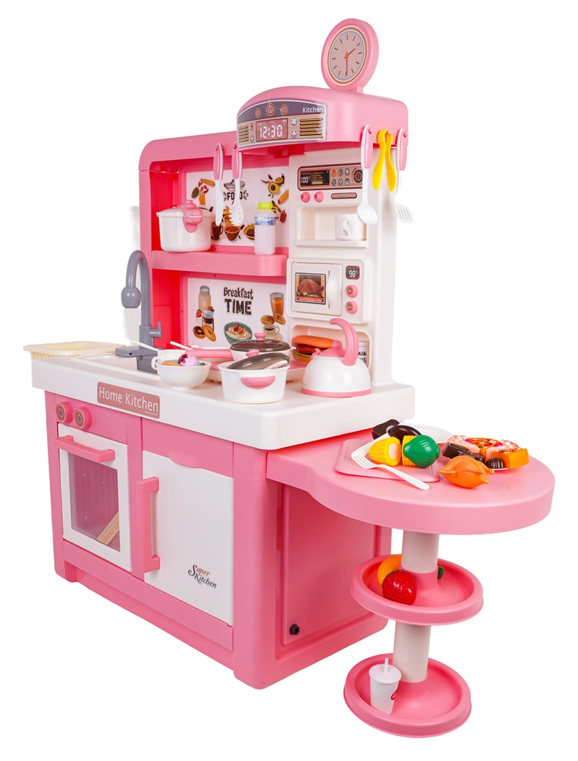 Cette cuisine interactive en rose et blanc est conçue pour un jeu créatif en toute sécurité. Les enfants profiteront d’éléments réalistes comme le micro-ondes, l’évier avec robinet, la plaque à induction, le four, la cafetière et le “réfrigérateur”. Les boutons rotatifs émettent des sons de cuisson et de friture, le brûleur éclairé avec affichage de la température intensifie l’ambiance, et une douce vapeur froide s’échappe d’une casserole.