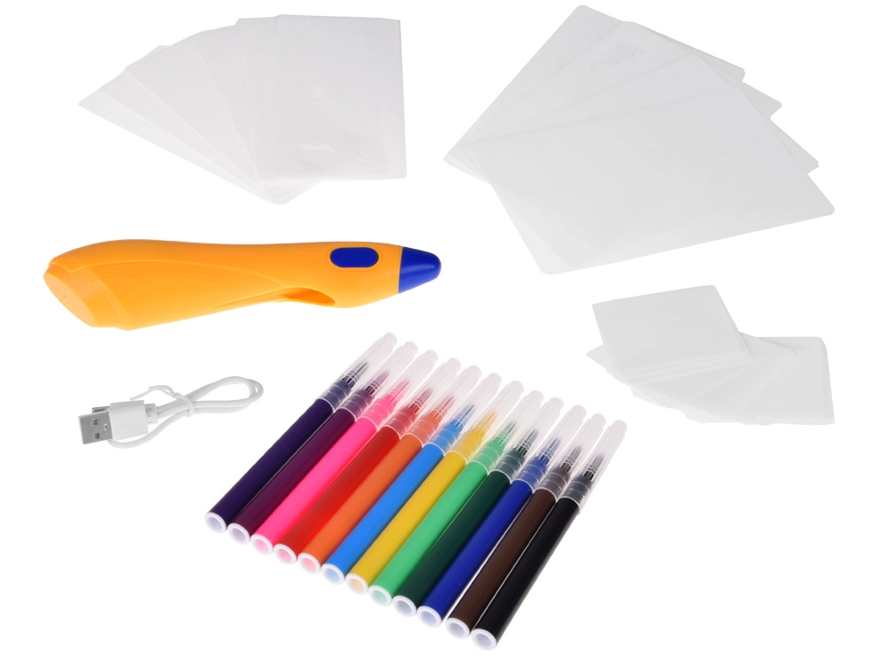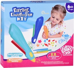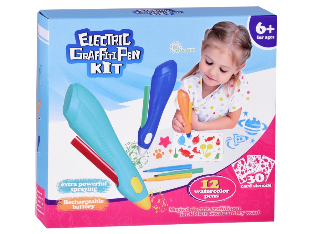 - Stylo aérographe électrique, 30 pochoirs, 12 feutres de couleur, câble USB