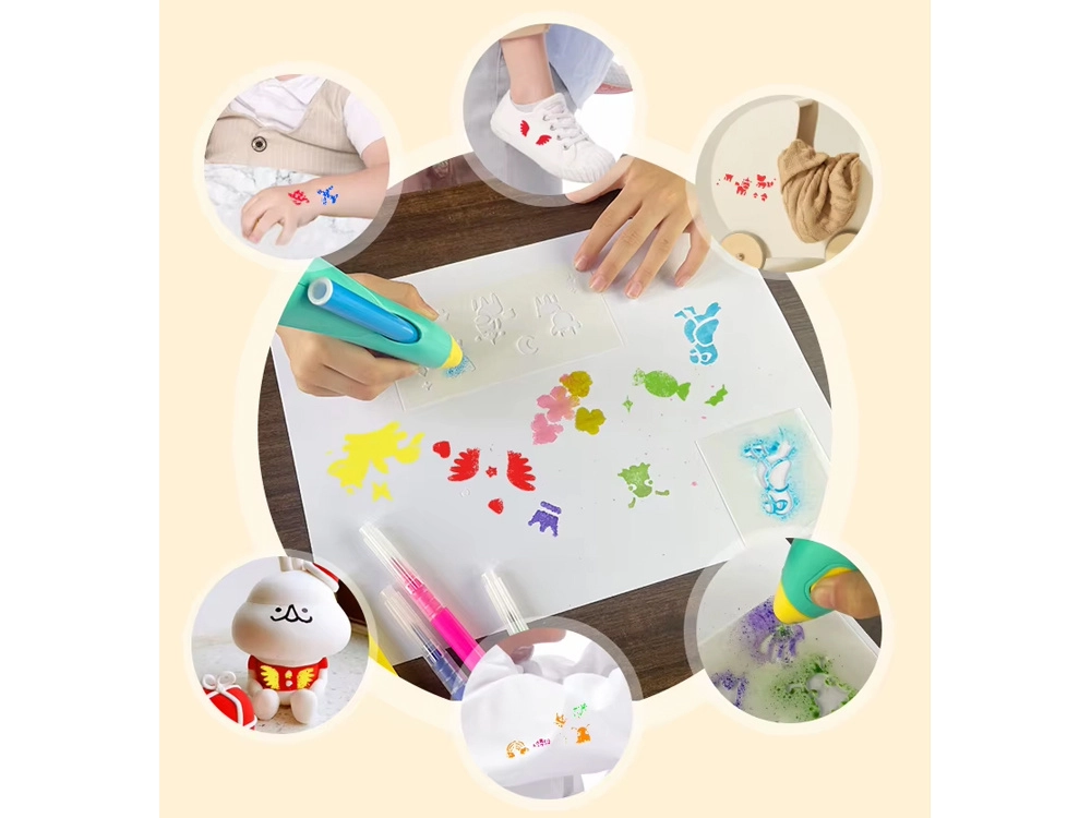 Un stylo aérographe créatif pour enfants transforme des feutres ordinaires en mini « spray » et crée une spray art moderne et des effets graffiti. Il suffit d’insérer le feutre choisi, d’appuyer sur le bouton et de peindre à travers des pochoirs réutilisables ou à main levée. Chargement USB‑C, forme ergonomique et un ensemble varié de pochoirs et de feutres stimulent la créativité et la motricité fine.