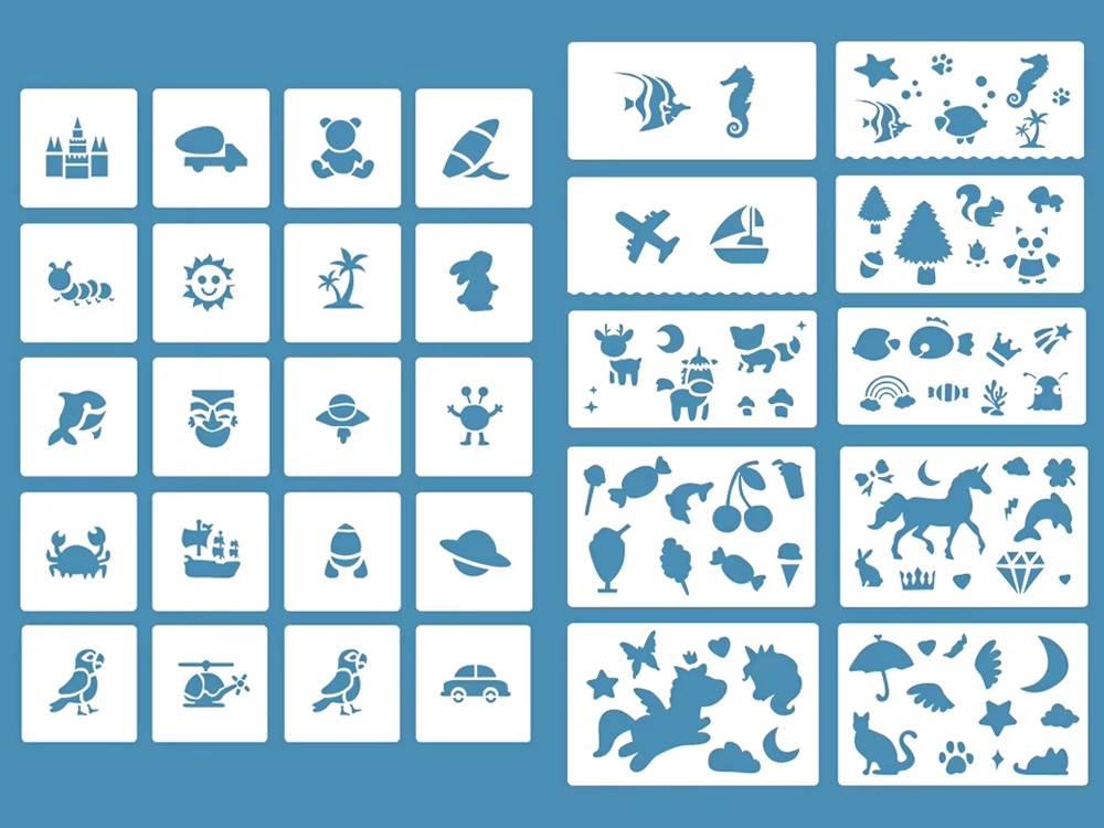 Les pochoirs en plastique lavables se rincent facilement à l’eau et peuvent être utilisés encore et encore – des animaux aux étoiles en passant par d’autres motifs.