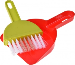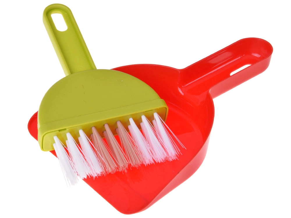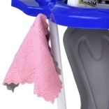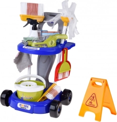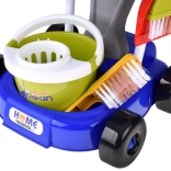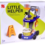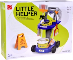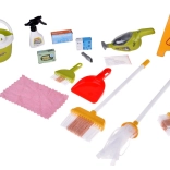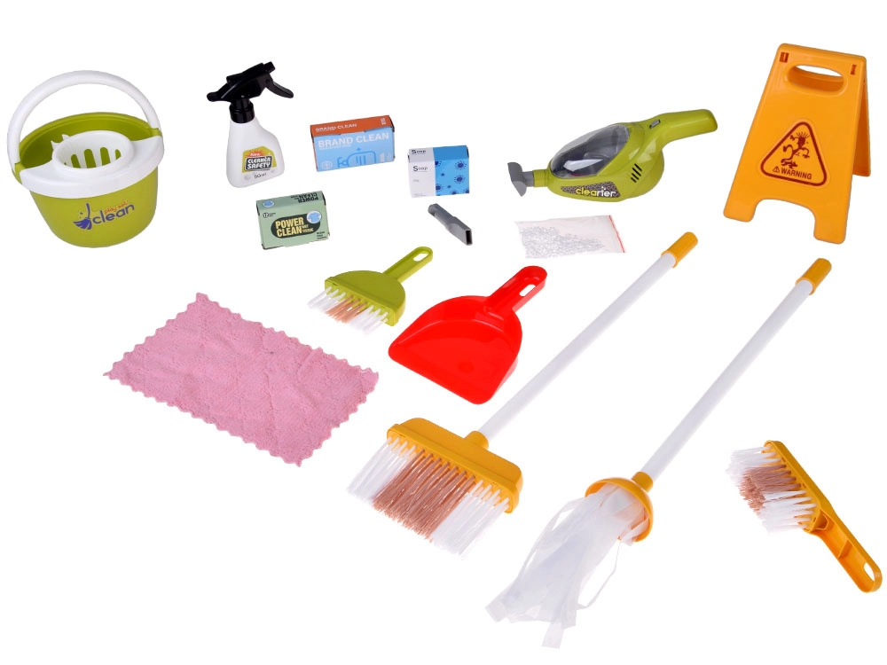 Serpillière, balai, petite balayette et pelle, seau avec essoreuse, chiffon, pulvérisateur, panneau d’avertissement et boîtes – tout ce dont les enfants ont besoin pour imiter les tâches ménagères.