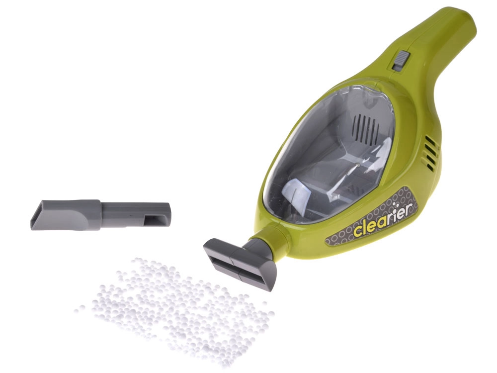 Le chariot présente des dimensions compactes, des supports et crochets pratiques pour les accessoires et, grâce à ses roulettes, les enfants peuvent l’emmener facilement dans chaque pièce. L’aspirateur jouet est interactif – après insertion de 3× piles AA (non incluses), il ramasse les billes fournies, ce qui rend le jeu encore plus attractif.