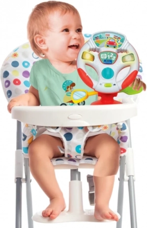 Le bouton éducatif accompagne les enfants dans la découverte des chiffres à travers des comptines ludiques. La clé allume et éteint le « moteur » et propose 2 modes de jeu. Le rétroviseur mobile et le levier de vitesse renforcent la motricité fine et la coordination. Grâce à la ventouse, le jouet se fixe facilement sur une surface plane – idéal sur le plateau de la chaise haute ou la table.