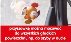 Grâce à la ventouse, vous fixez facilement le caneton sur des surfaces lisses – par exemple sur la chaise haute, la table ou une vitre de voiture. L’anneau de dentition en silicone soulage lors des poussées dentaires et les éléments rotatifs et coulissants développent la coordination œil–main.
